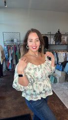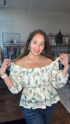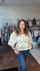 Effortless elegance meets cozy charm in our Floral Print Gauze Top. With a flattering square neckline, smocked bodice, and flared hem, it gracefully draws the eye while offering a softly defined silhouette. The balloon sleeves, gently gathered into relaxed cuffs, add a dreamy, fluid movement that's both whimsical and feminine. Crafted from breathable cotton gauze, this relaxed, easy pullover piece features delicate embroidered touches throughout, elevating its boho-chic aesthetic.