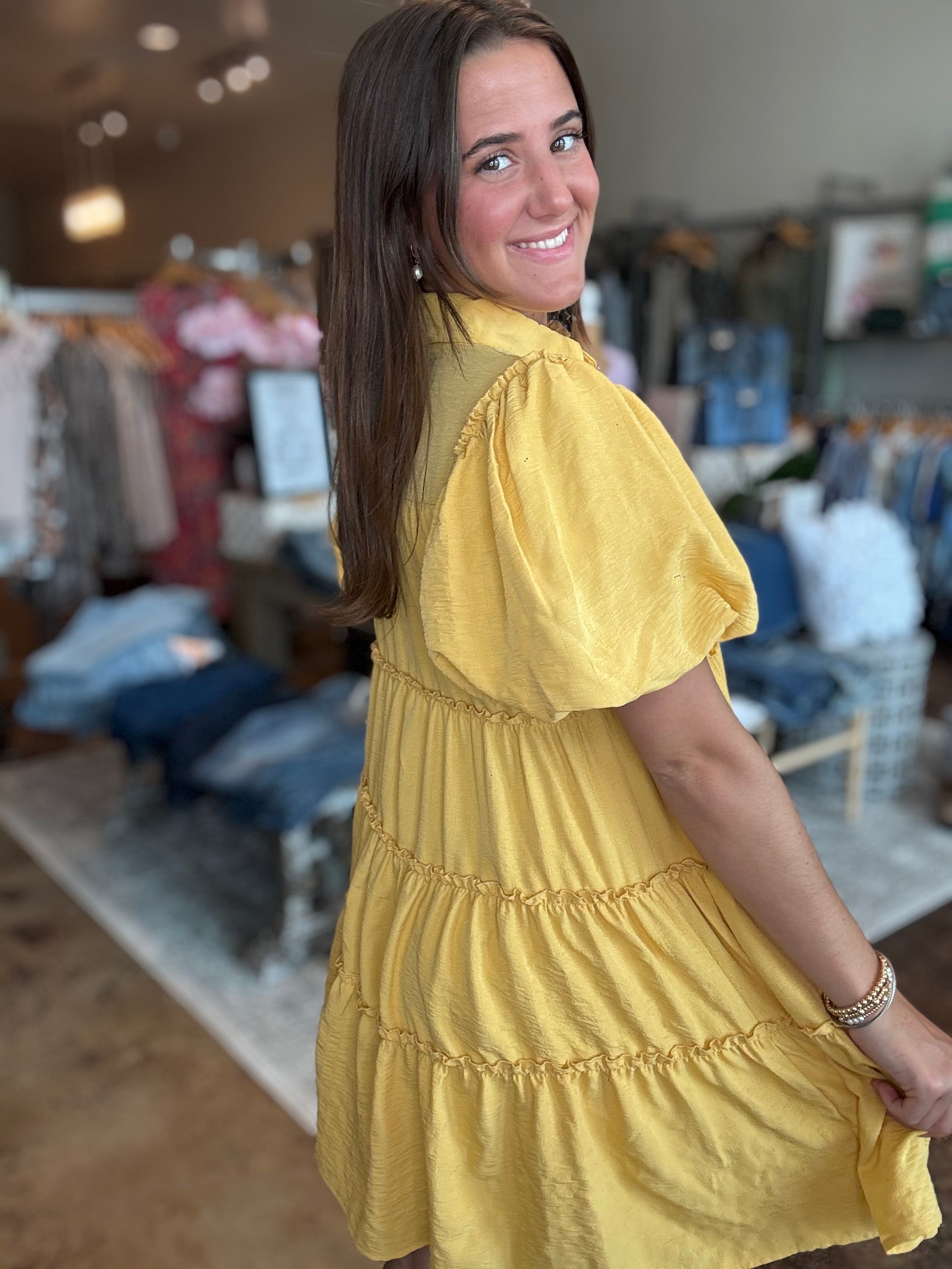 Meet your new favorite days-into-evenings dress: our Puff Sleeve Button Down Tiered Dress. Crafted in a softly textured woven fabric, it feels light and breezy yet holds its shape beautifully. The puff sleeves add playful volume without overwhelming the design, while a crisp collar and front button closure bring a hint of structure—ideal for when you want polished ease without effort. Framing the silhouette, the bodice opens into gentle tiers that lend subtle movement and a touch of swing as you walk.