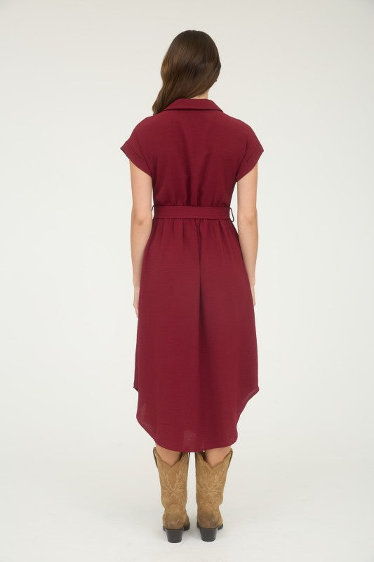 Elevate your wardrobe effortlessly with our Button Down Belted Midi Dress, where timeless sophistication meets functional charm. Tailored with a crisp collar and neatly folded short sleeves, it frames the neckline with understated polish while offering everyday comfort. Thoughtfully placed pockets add a practical yet refined detail, and the included matching belt—securely threaded through discreet loops—allows you to cinch the waist for a flattering silhouette. Crafted in a solid hue and tailored to midi length, this unlined dress moves gracefully from brunch to boardroom with feminine ease.