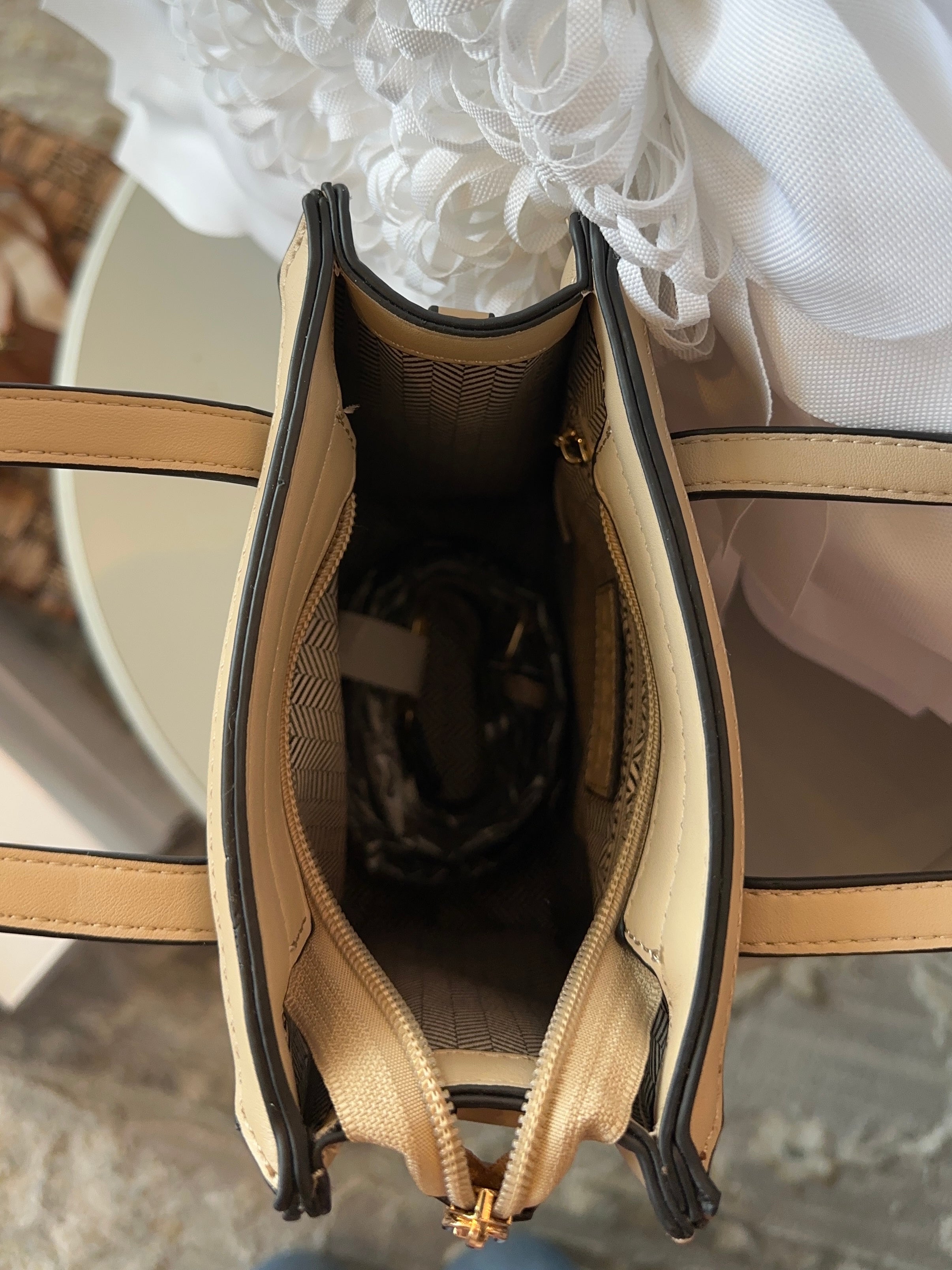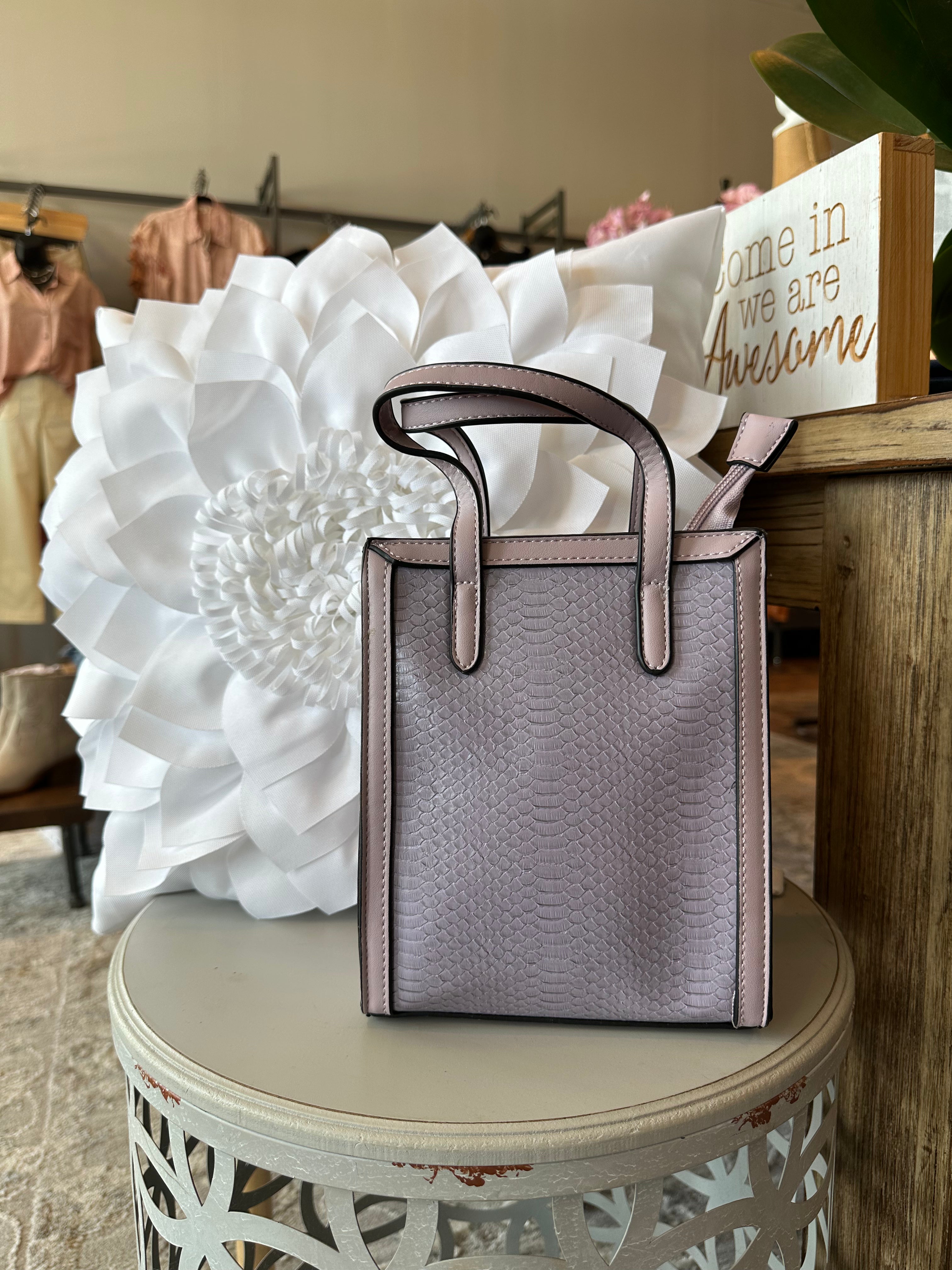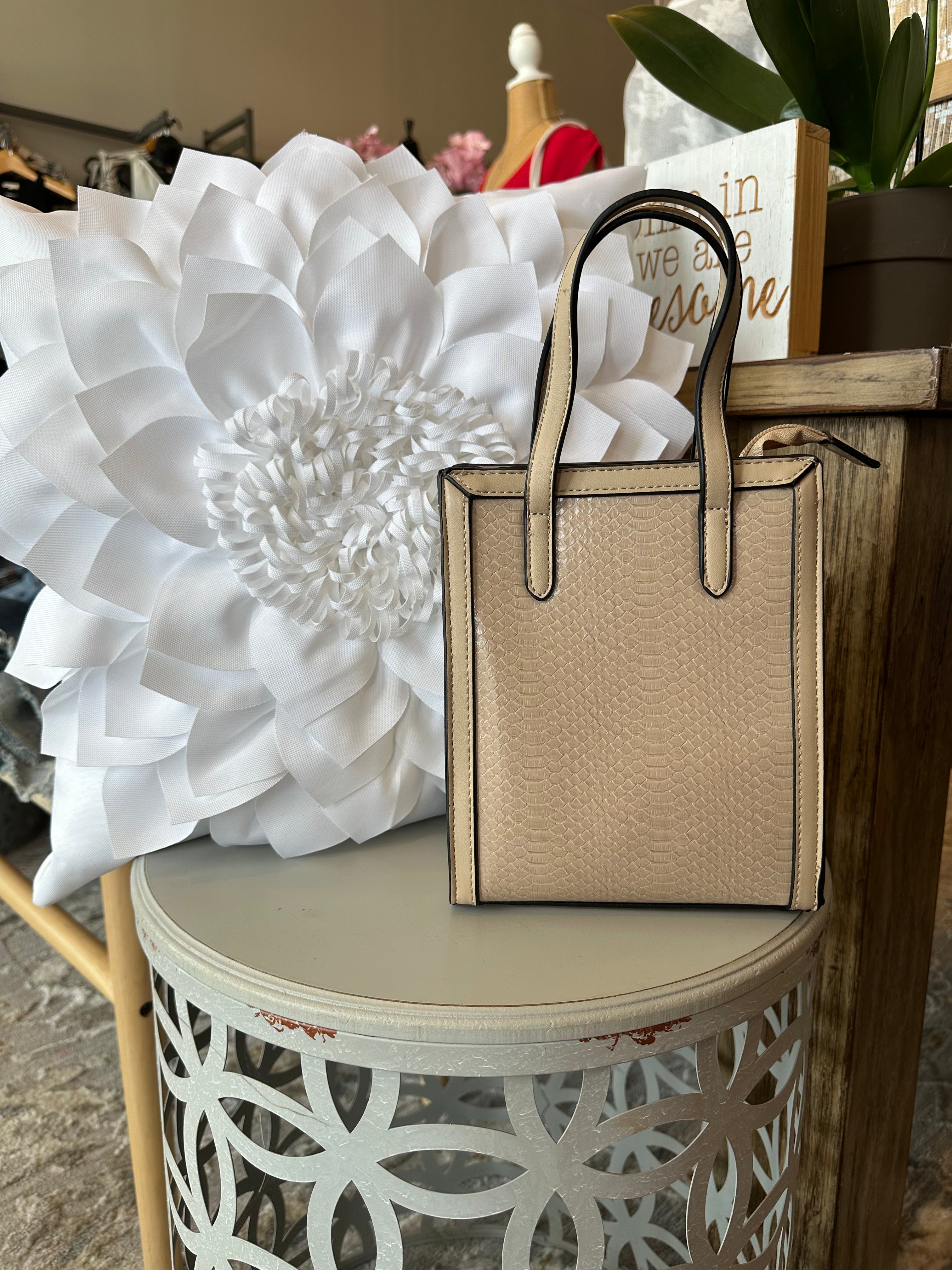 Crafted with a snake-embossed texture and accented by gold-tone hardware, this rectangular satchel features dual top handles plus an adjustable, removable crossbody strap for versatile styling. It closes securely with a zip-top and includes a fully lined interior with a wall zipper pocket for easy-access items. A flat base ensures the bag stands upright, while its sleek silhouette makes it the ideal companion for work, errands, or evenings out.