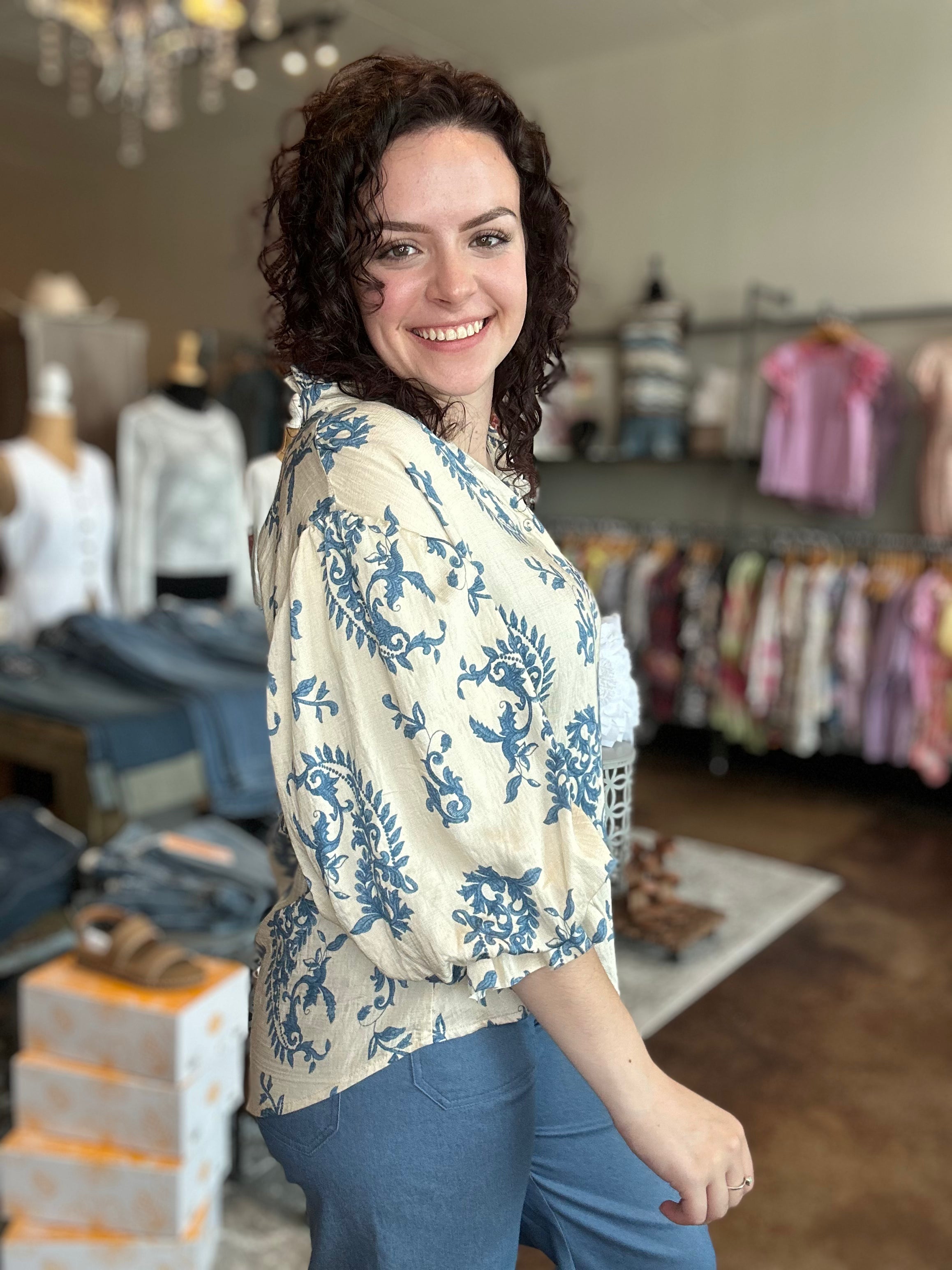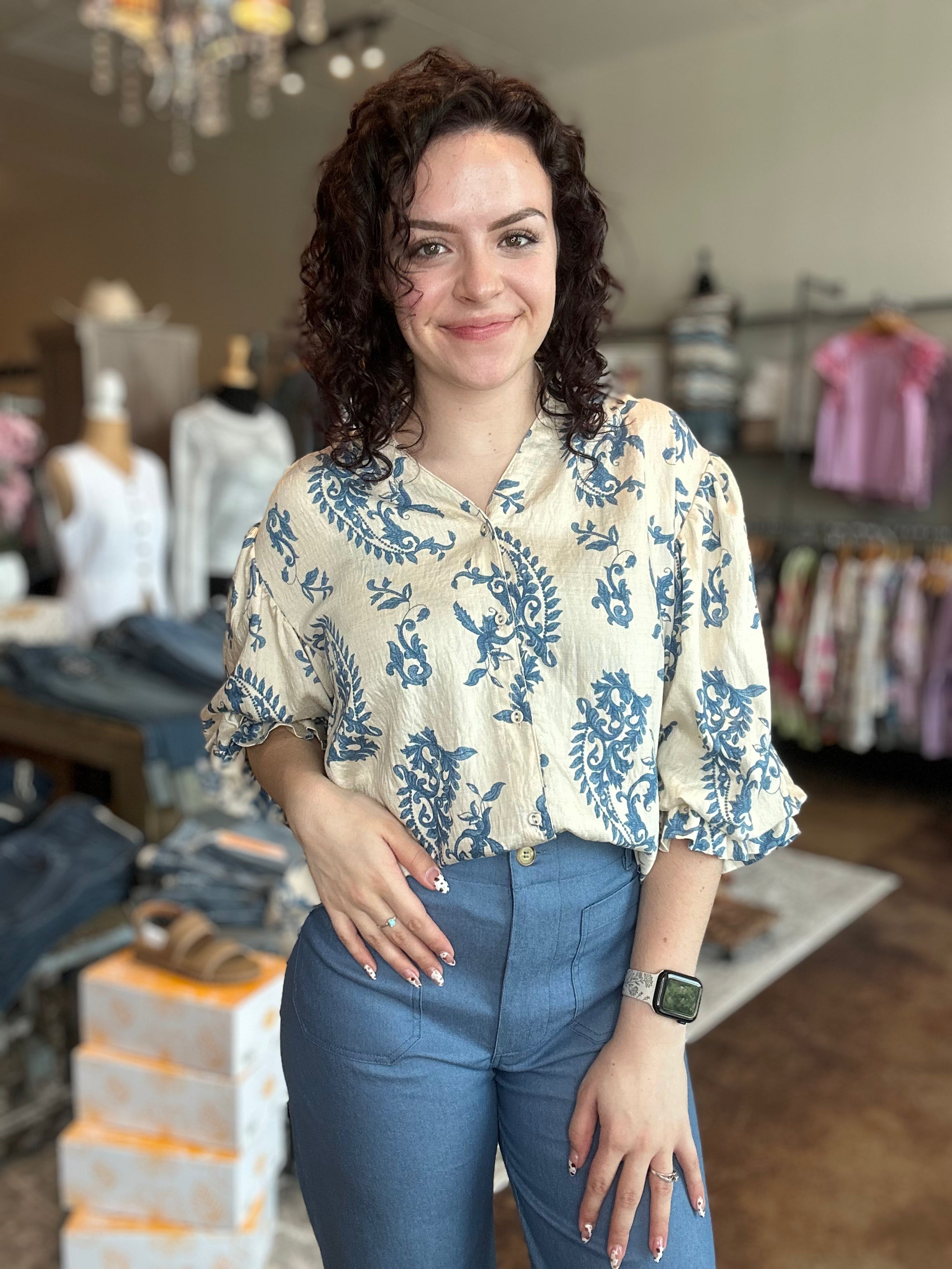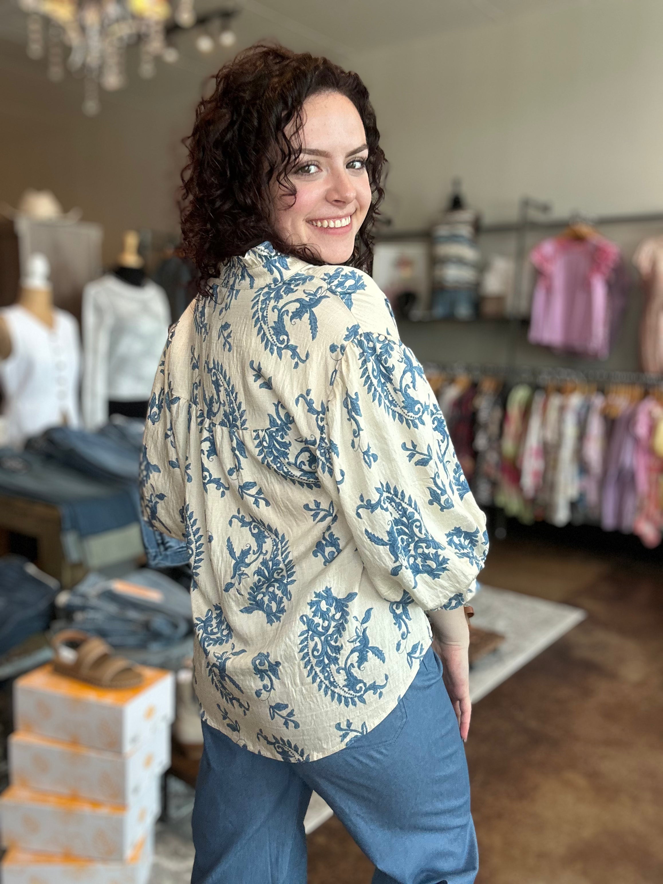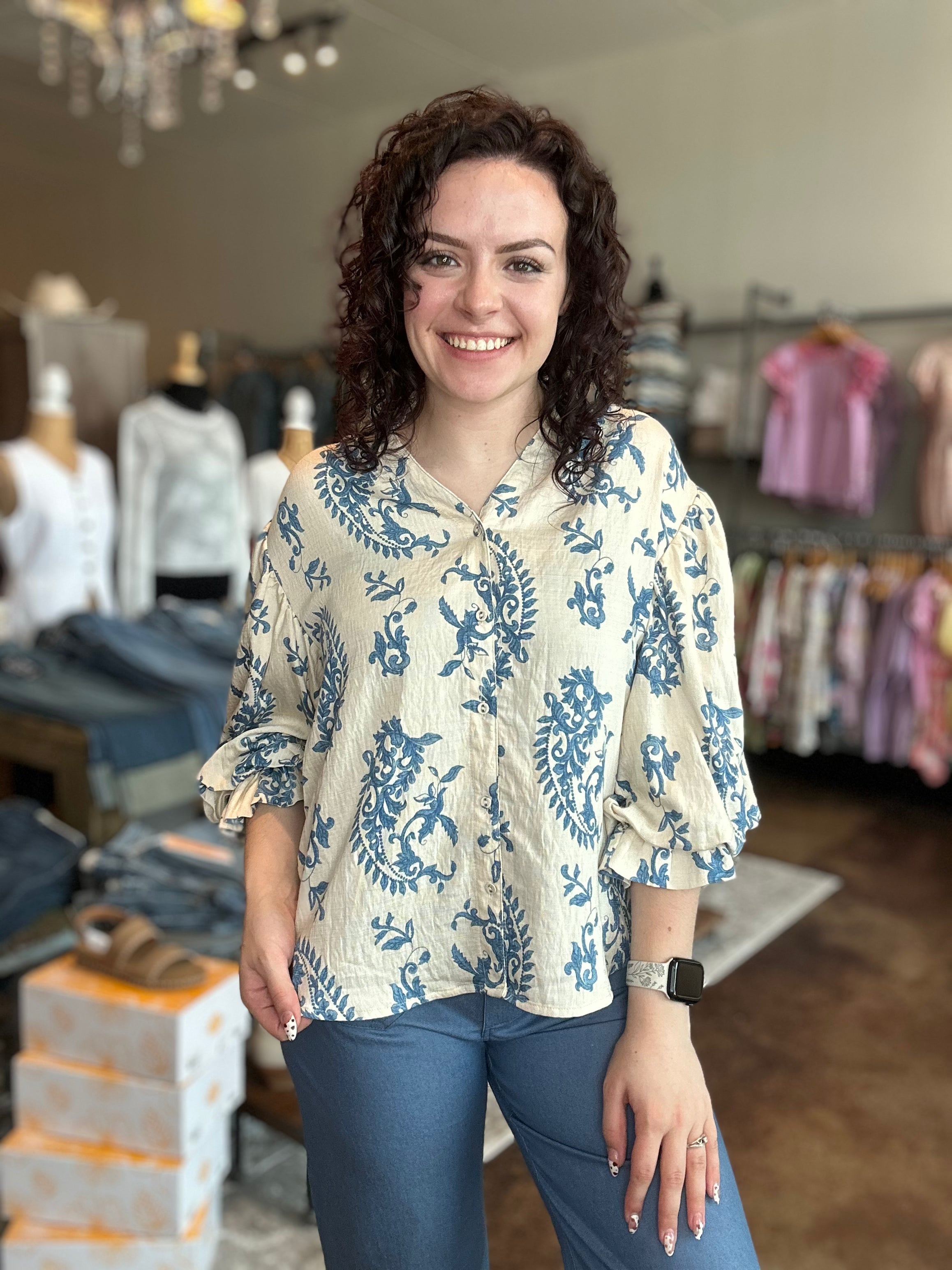 Button Down Blouse With 3/4 Length Balloon Sleeves