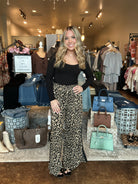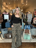Add a fierce touch to your off-duty look with these effortlessly cool Ribbed Animal Print Wide Leg Pants. Designed with wide cropped legs, side pockets, and a rib knit texture, they offer the perfect blend of comfort and edge. The elastic waistband with adjustable drawstring ensures a flexible fit, while the contrasting side trim adds a sporty, modern vibe.