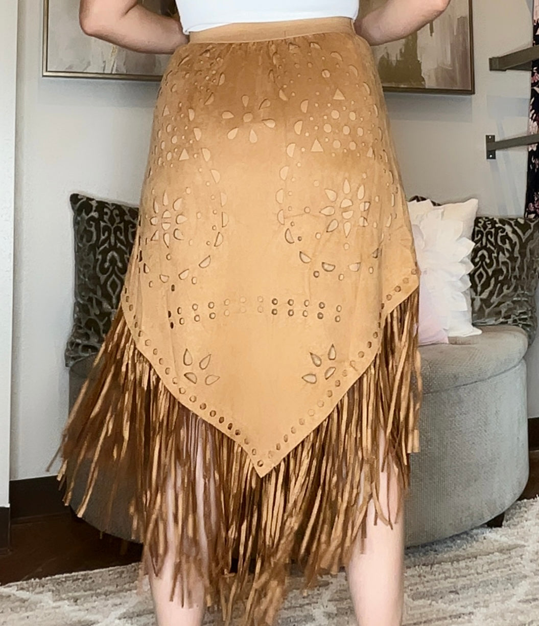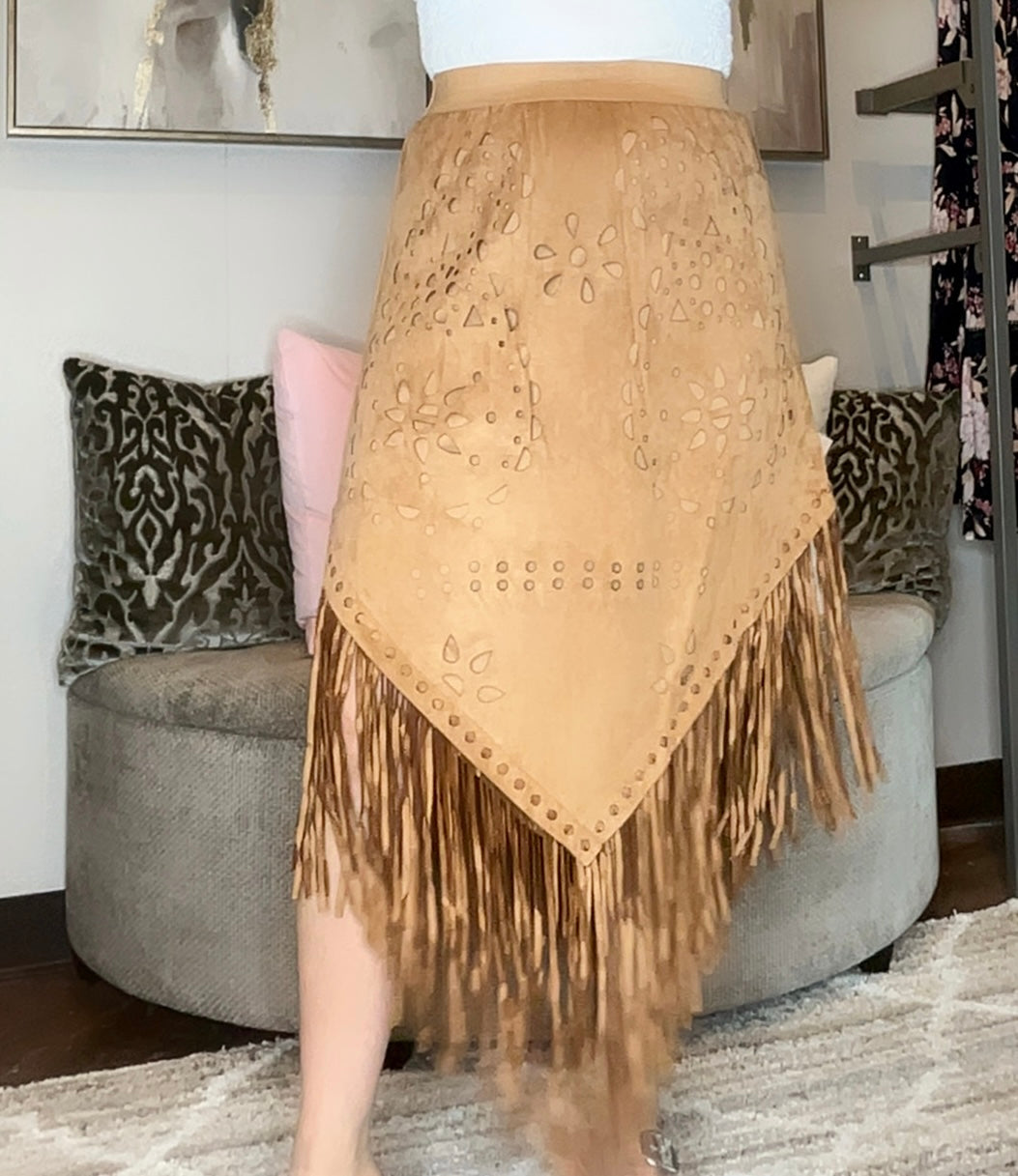 Upgrade your wardrobe with our stylish Suede Skirt w/ Fringe. Made from high-quality suede, this skirt features trendy fringe detailing for a modern look. Enjoy the luxurious feel of suede while making a fashion statement. Perfect for any occasion, it's a must-have for any fashion-forward individual.