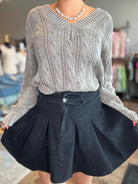 Slide into our effortlessly playful Pleated Washed Denim Skirt—where carefree charm meets practical punk. The softly washed denim and raw-edge waist give off a cool, undone vibe, while the crisp pleats add movement and flair. Hidden lining shorts keep things worry-free, and handy pockets tuck away your essentials with ease. It’s the perfect go-to for day-to-night adventures—think festival cuts or brunch wanderlust—with a nostalgic nod to ’90s denim trends that are totally back in style.