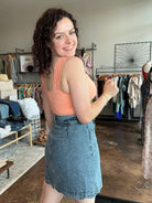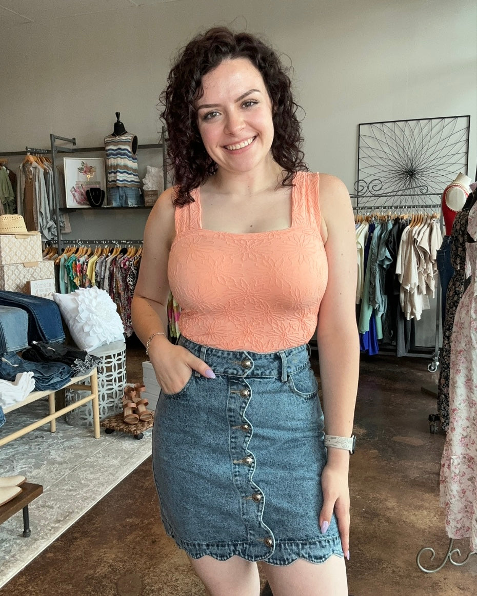 Elevate your wardrobe with this charming Scallop Button Front Denim Skirt. Crafted from premium denim, this skirt features a flattering A-line silhouette that gracefully skims the figure. The distinctive scalloped edges add a touch of femininity, while the button-front closure offers both style and functionality. Designed to sit comfortably at the waist, this skirt pairs effortlessly with a variety of tops, from casual tees to dressy blouses