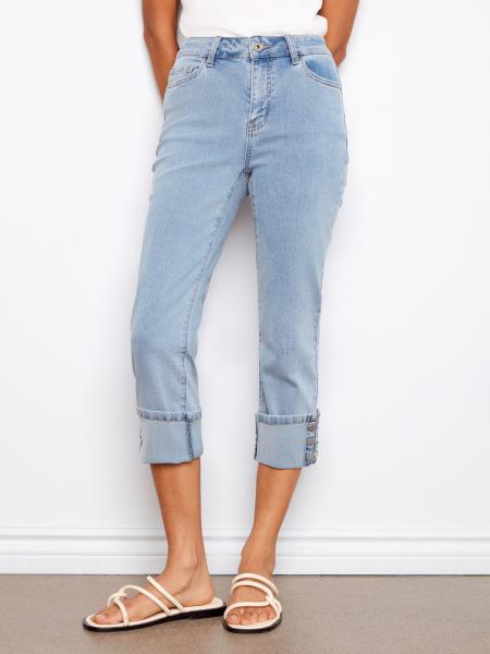 Stretch Denim Narrow Leg Pants W/ Cuff Snap Detail Hem