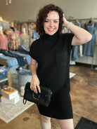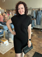 Elevated comfort meets timeless style in our Short Sleeve Mock Neck Sweater Dress. Crafted from a cozy, ribbed knit, this versatile piece features a structured mock neckline, short sleeves, and a relaxed silhouette that effortlessly flatters. The single front pocket adds a touch of casual charm that makes it a wardrobe staple you can dress up or down. Pair it with boots and a belt for a polished look or wear it with sneakers for cozy everyday chic.