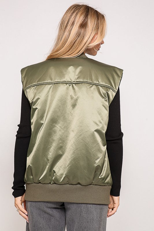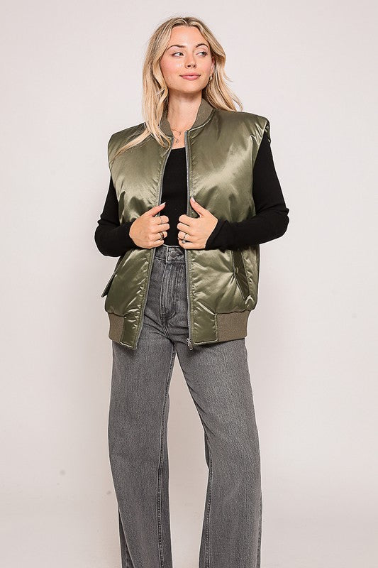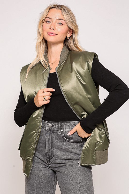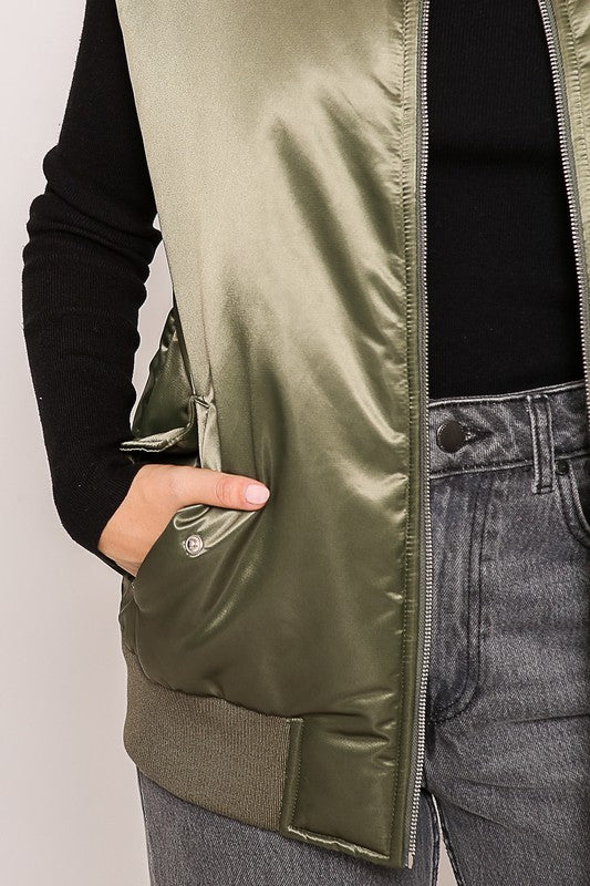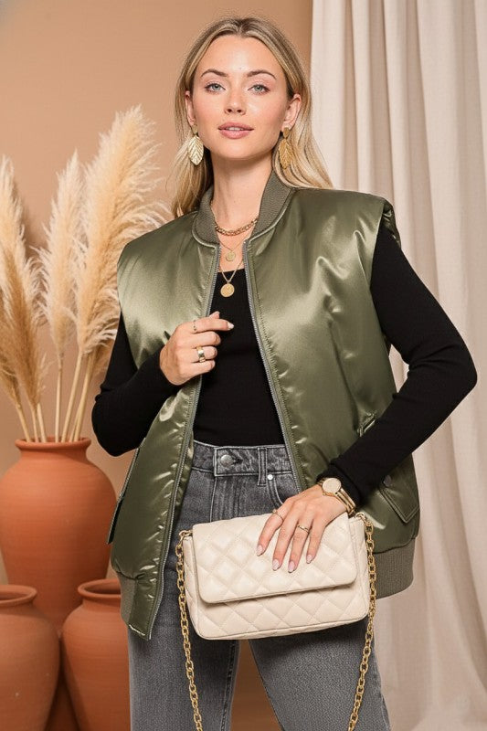 Elevate your layering game with this luxe satin bomber vest in rich olive. The smooth, lustrous fabric drapes beautifully while the classic bomber silhouette adds instant edge to any outfit. Perfect for transitional seasons, pair it over basics for effortless sophistication or throw it on for a polished finishing touch. A versatile wardrobe essential that works as hard as you do.