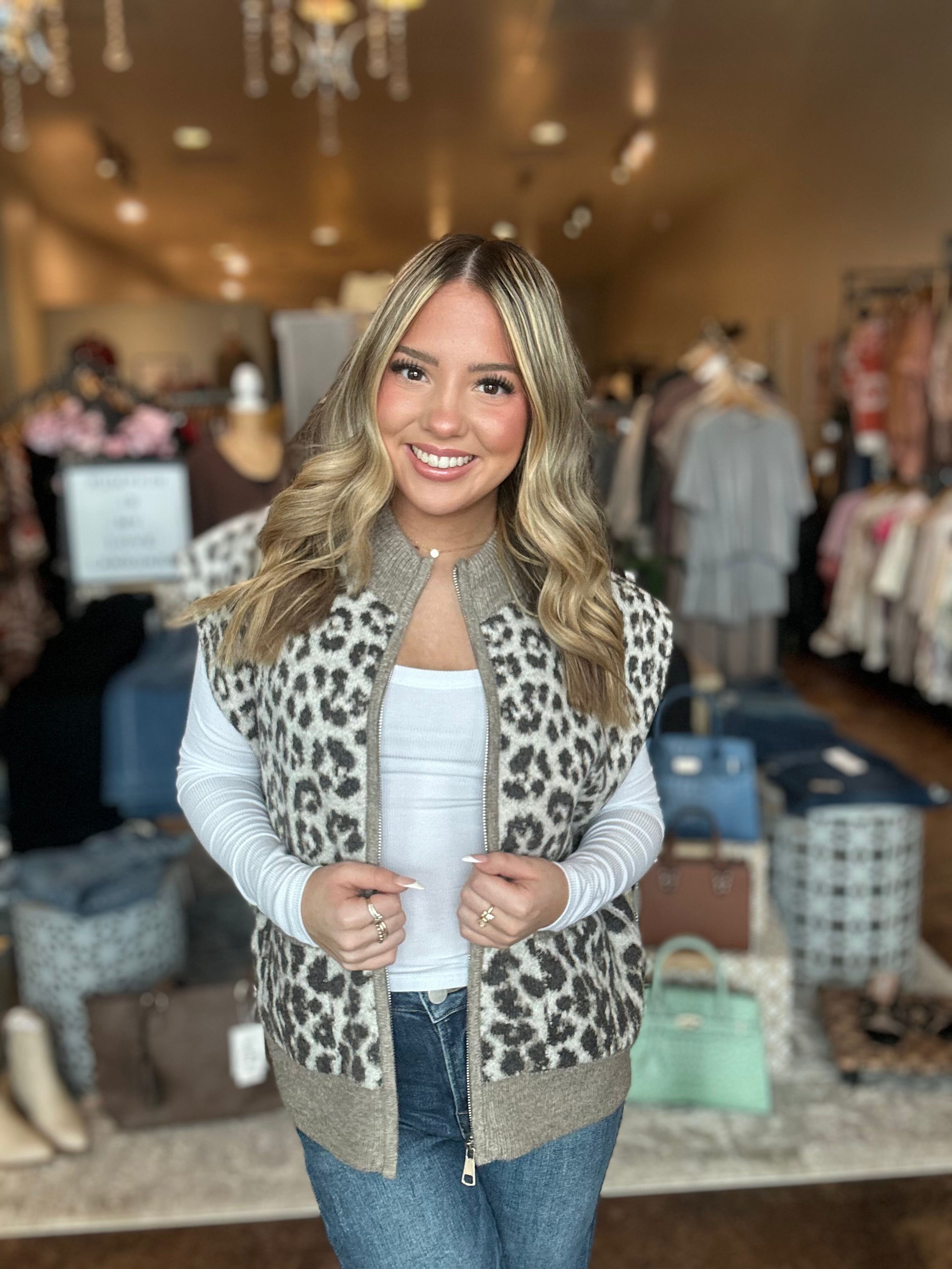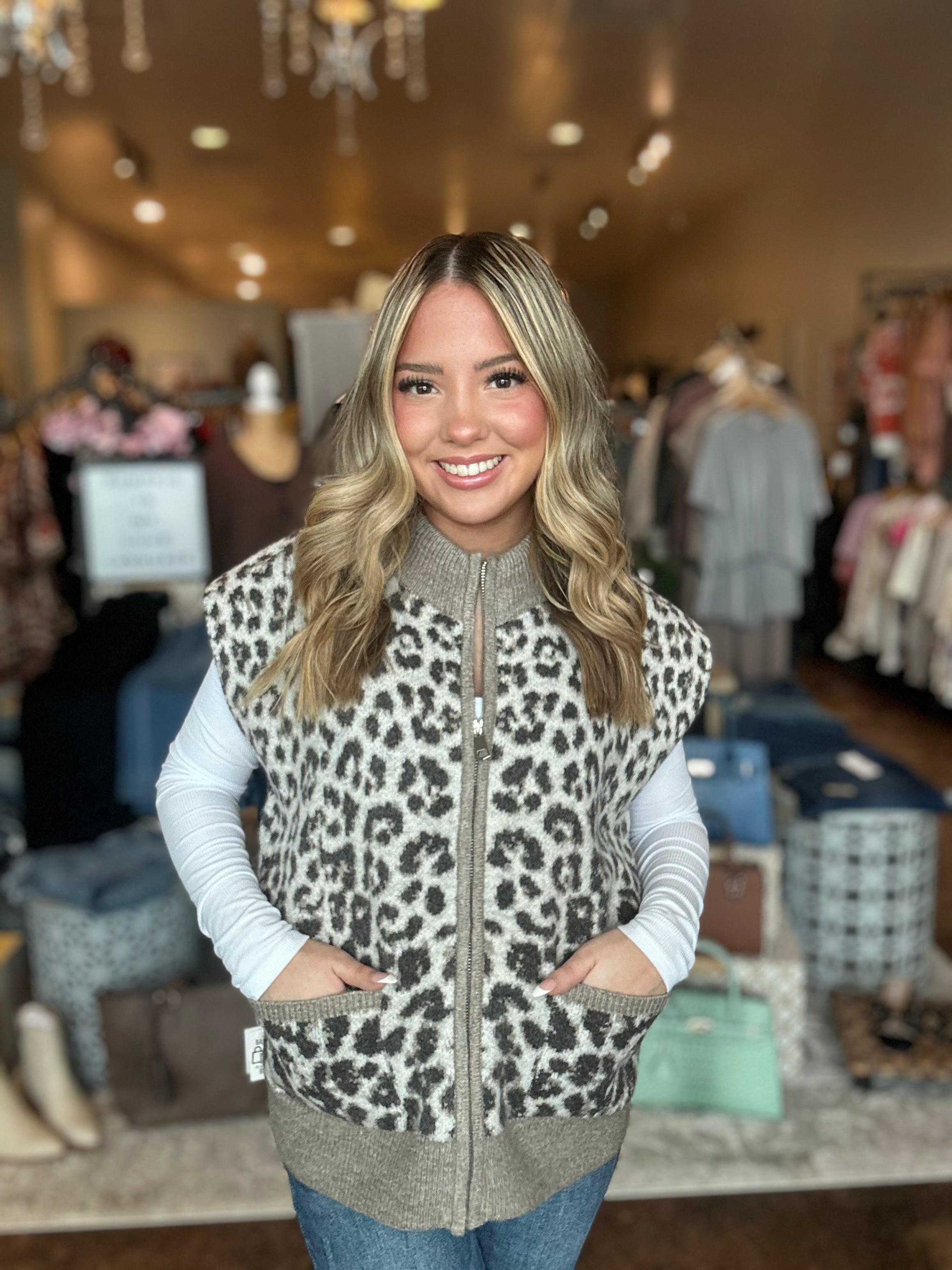 Turn heads with our Zip-Up Sweater Vest, a bold and cozy piece that adds instant edge to your layering lineup. Designed with a modern mock neck and full zipper closure, this leopard-patterned vest features extended short sleeves and convenient front pockets for both style and function. The perfect blend of comfort and statement-making style, it’s a must-have piece to elevate any casual or layered look.