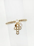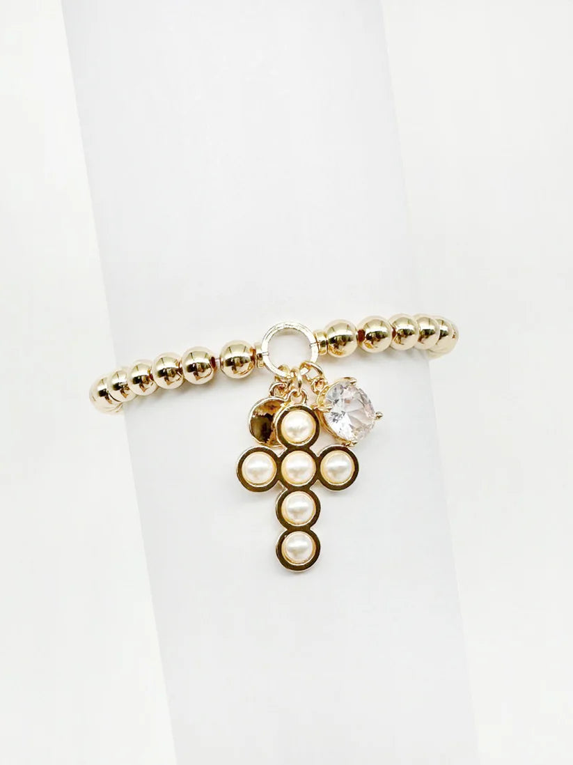 Gold Beaded Stretch Bracelet With Pearl Cross And Crystal Charms
