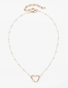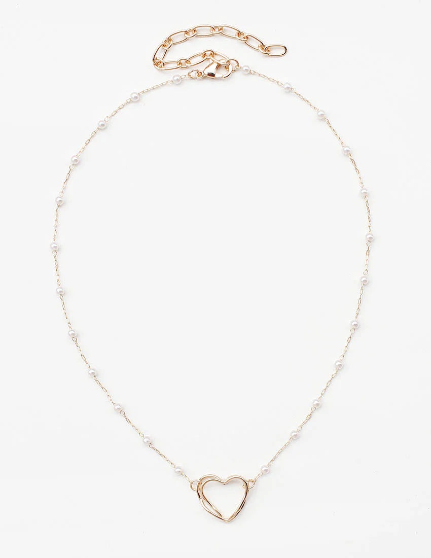 Let your everyday jewelry tell a story with this delicate necklace featuring subtle pearl beads strung along a fine chain, finished with a softly textured open-heart charm that rests just below the collarbone. Adjustable between 16″ and 18″, it drapes beautifully layered or worn solo for understated flair. Our necklace blends soft texture with delicate sparkle in a piece that transitions smoothly.