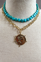 Double layer chain necklace with double-sided coin charm at bottom. One layer features a larger gold chain and one layer features turquoise beads.