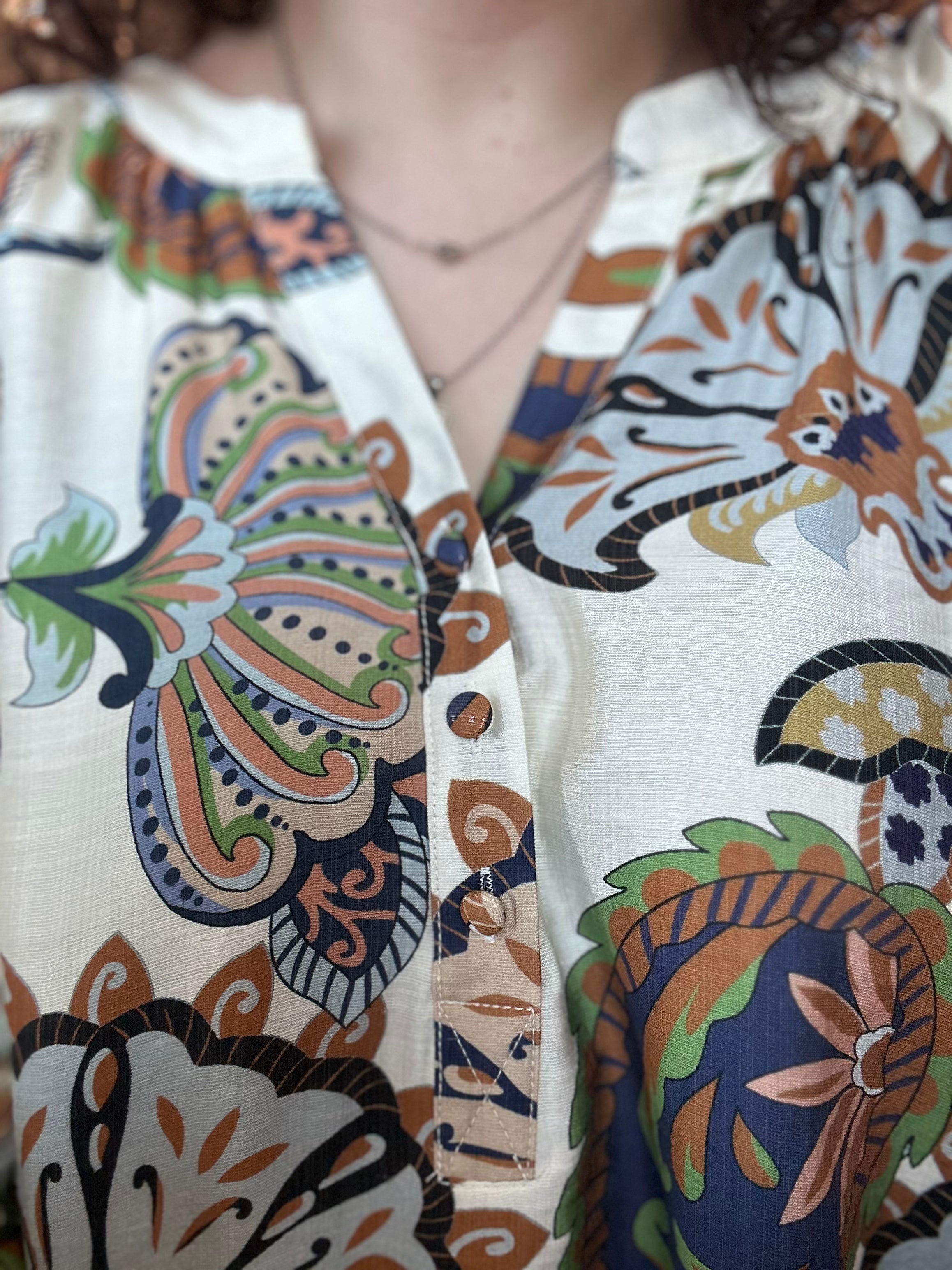 The Boho Paisley Puff Sleeve Top features a relaxed silhouette with a split neckline, mid button detail, and 3/4 puff sleeves. Designed with an exclusive paisley print, this lightweight top adds a bold, effortless bohemian touch to any look.