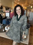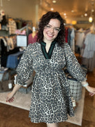 Fierce meets feminine in this effortlessly stylish leopard print dress, featuring a bold contrast collar for a touch of modern polish. Designed with a flattering elastic waist and elasticized 3/4 sleeves, this knee-length silhouette offers both comfort and shape in all the right places.