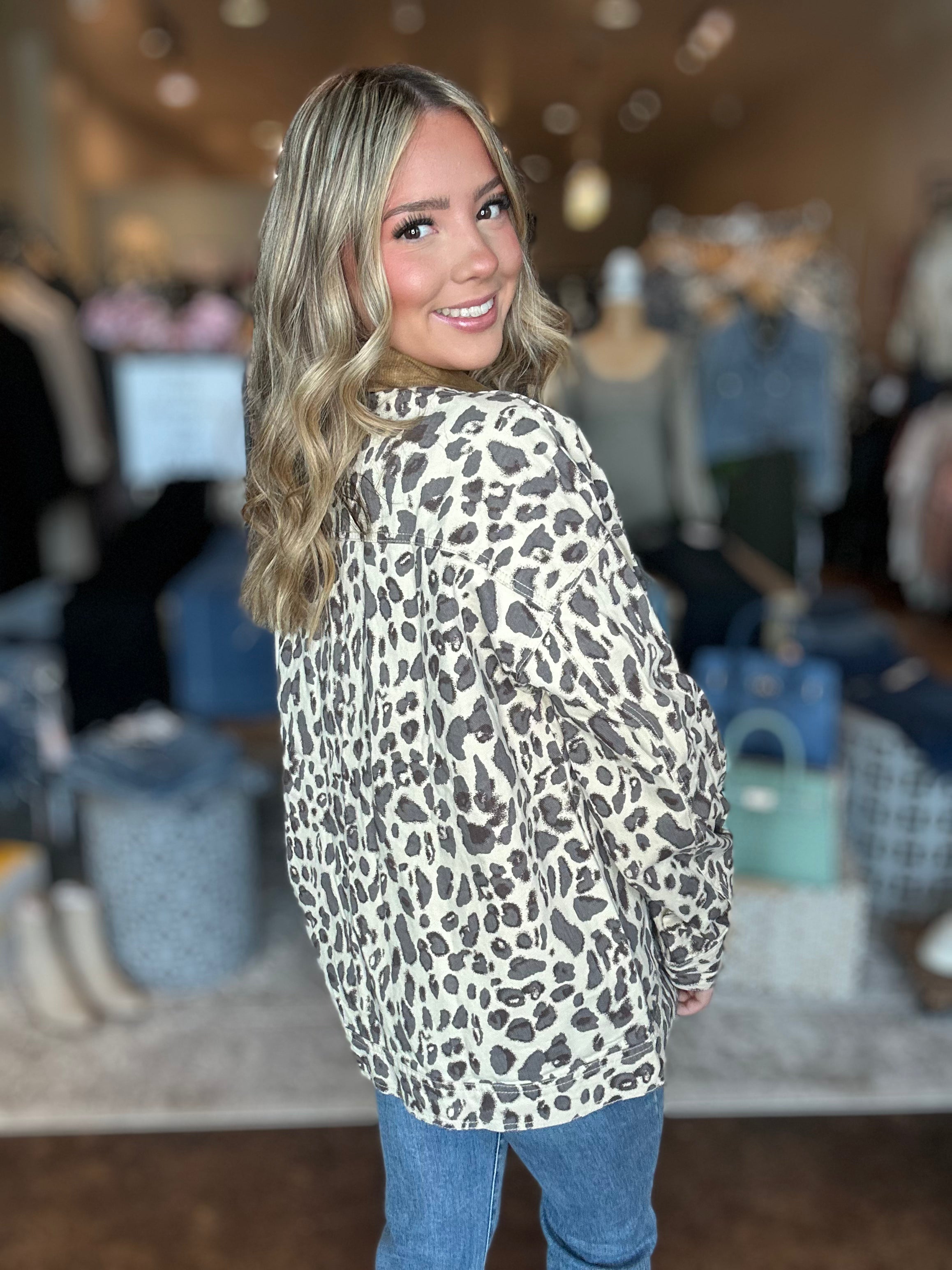Make a bold statement with our Contrast Collar Leopard Print Jacket. This standout piece features an all-over leopard pattern and a crisp contrast collar for a touch of modern edge. Designed with a button-front closure and flap cargo pockets for utility-chic vibes, it’s the perfect layering piece to elevate your everyday look. Unlined and midweight, it offers structure without bulk—ideal for transitional seasons. Woven, non-sheer, and ready to roar.