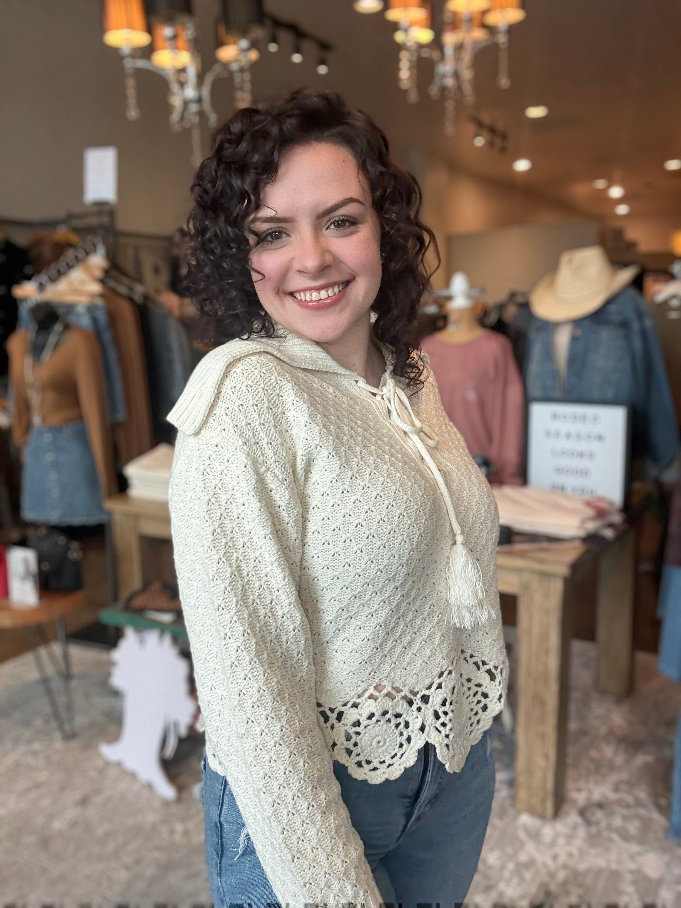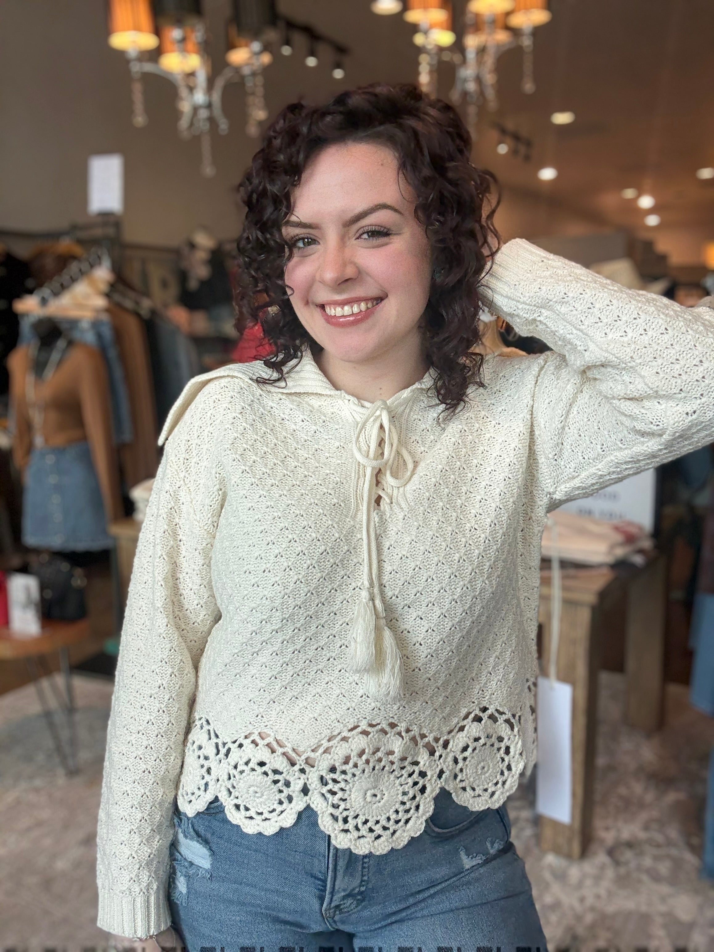 Soft, feminine, and beautifully detailed, the Crochet Trim Tie-Neck Knit Top is the perfect blend of cozy texture and delicate charm. This lightweight knit features an intricate open-knit pattern for breathability and visual interest, while the tie-neck detail adds a romantic, boutique-inspired touch. The standout crochet trim along the hem creates a scalloped finish that feels both timeless and uniquely special.