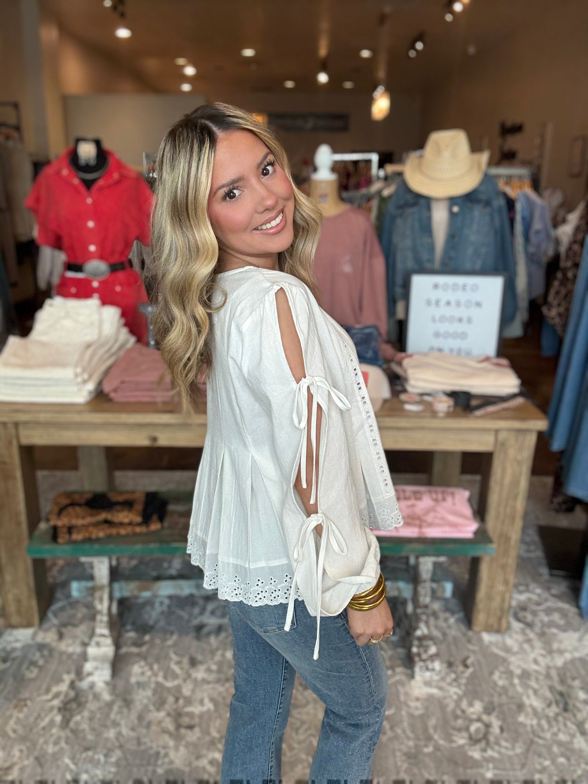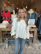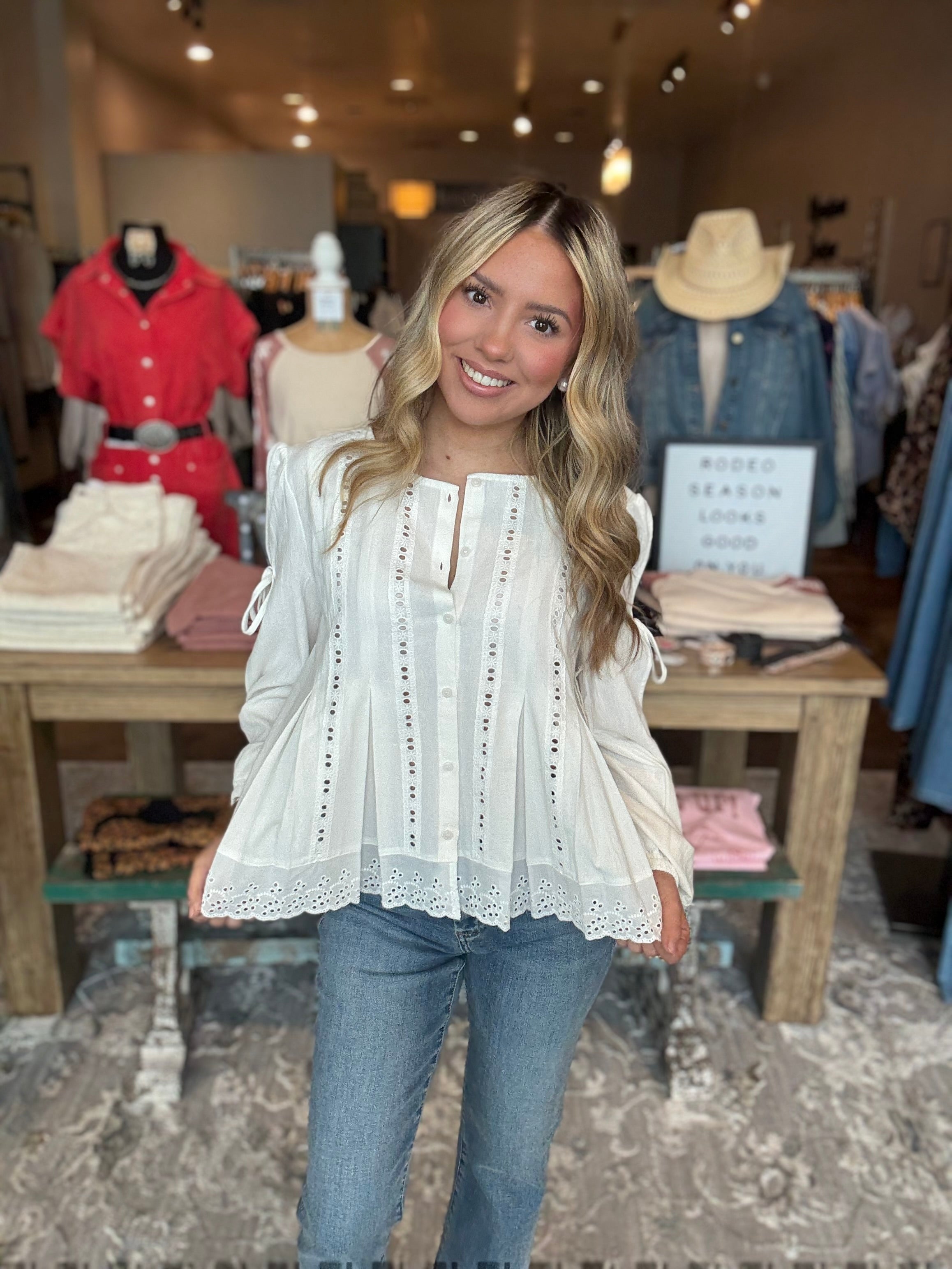 Light, airy, and effortlessly feminine, the Eyelet Pintuck Button-Front Blouse is the kind of piece that feels timeless from the moment you put it on. Designed with delicate pintuck detailing and subtle eyelet accents, this blouse blends classic texture with an easy, relaxed silhouette. The button-front styling and soft tie sleeves create a polished yet comfortable fit that works beautifully for both casual days and dressed-up moments.