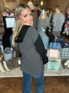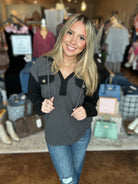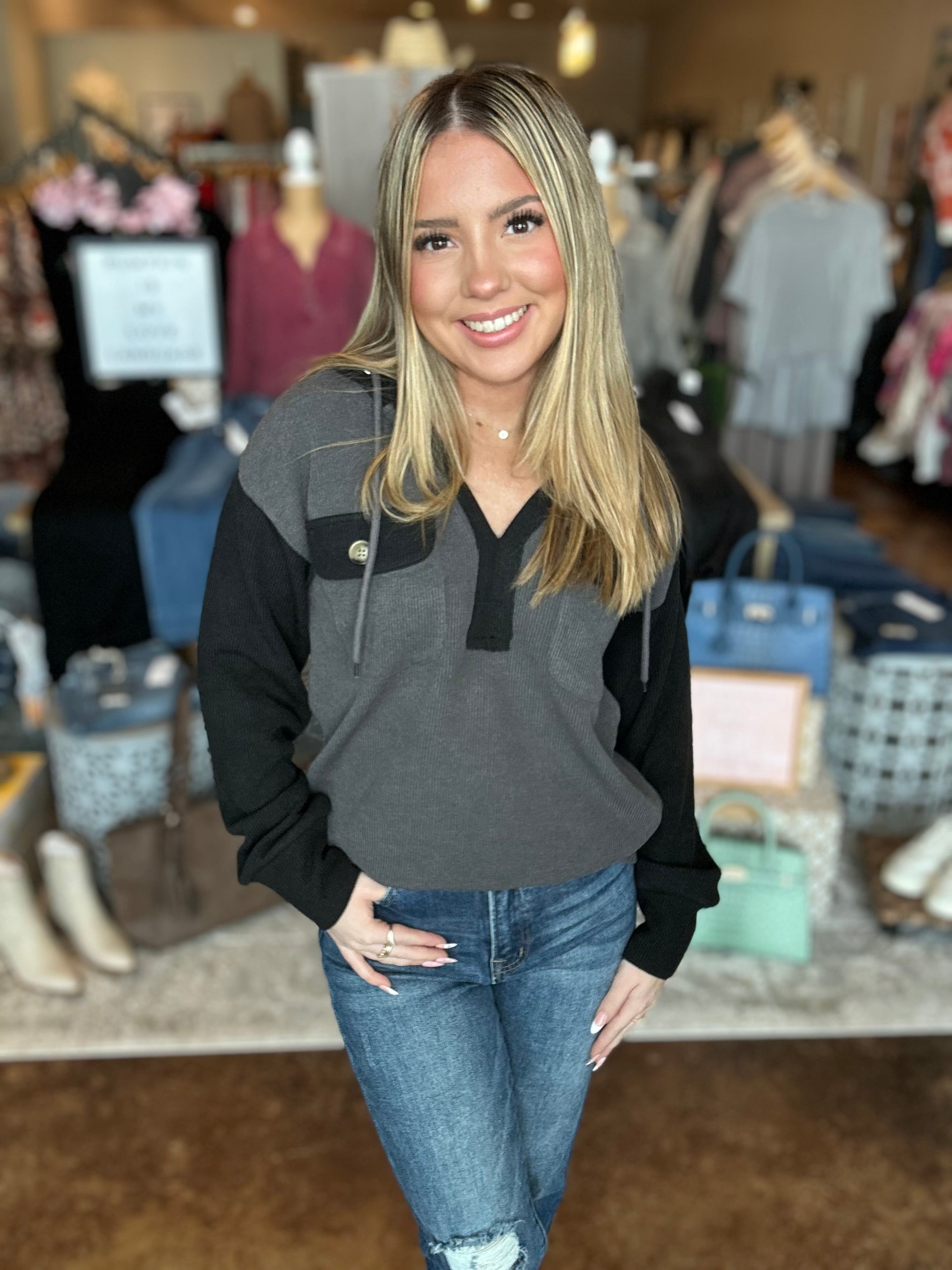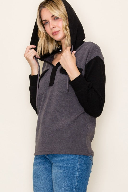 Cozy up in style with our Split Neck Hoodie Top, designed with all the details you love. This relaxed piece features a split neckline with a functional drawstring, two buttoned chest pockets for a touch of utility, and long sleeves for added warmth. The bold color-blocked design adds a modern edge, while the heavier knit fabric makes it the perfect go-to for cooler days. Whether you're lounging or layering up, this hoodie combines comfort and effortless style.