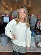 Our Striped Double Layer Knit Pullover combines casual comfort with a stylish twist. Designed with exposed seam detailing and a contrast black-and-white striped hem and neckline insert, this cozy knit gives the illusion of a layered outfit in one easy piece. The slight high-low hem and relaxed fit make it a flattering, throw-on-and-go essential for everyday wear.