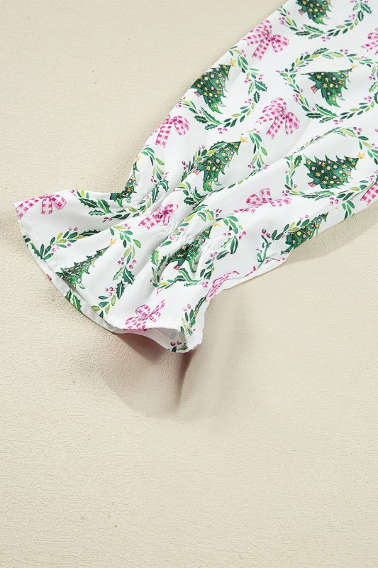 Festive, comfy, and just the right amount of cute — our Cozy Christmas Bow Knot Loungewear Pajama set is made for cozy mornings and twinkly-light nights. Featuring an allover holiday print with sweet Christmas trees and bows, this matching top and shorts combo is equal parts playful and polished.