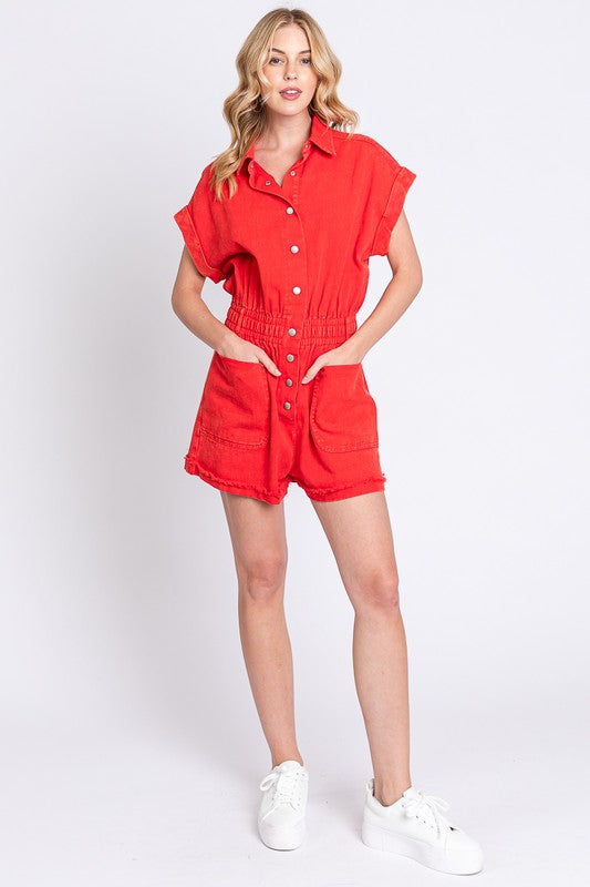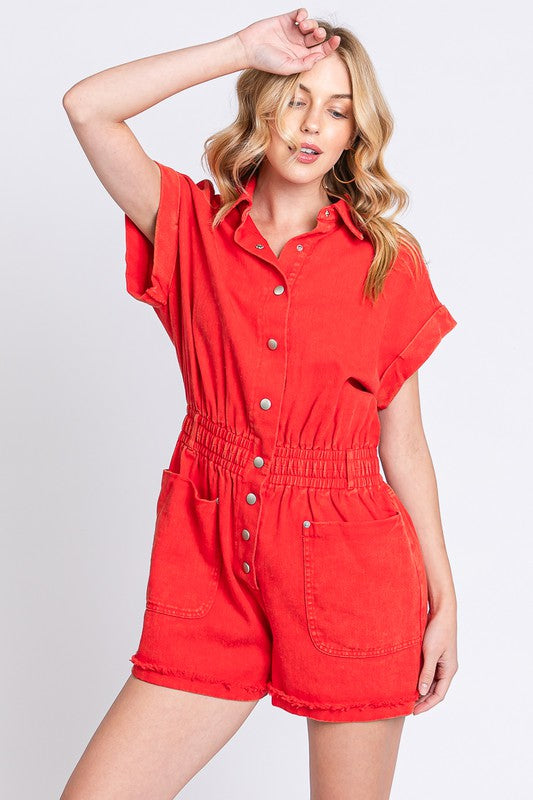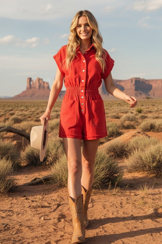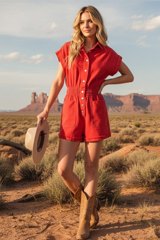 Effortlessly chic and undeniably comfortable, this mineral washed button down denim romper delivers vintage-inspired style with modern appeal. The worn-in look gives it authentic character, while the rich vintage red hue makes a bold statement. Perfect for casual outings or dressed-up occasions, the button-down front and romper silhouette offer versatile styling options. Soft, breathable denim keeps you comfortable all day long, whether you're running errands or heading out for an adventure.