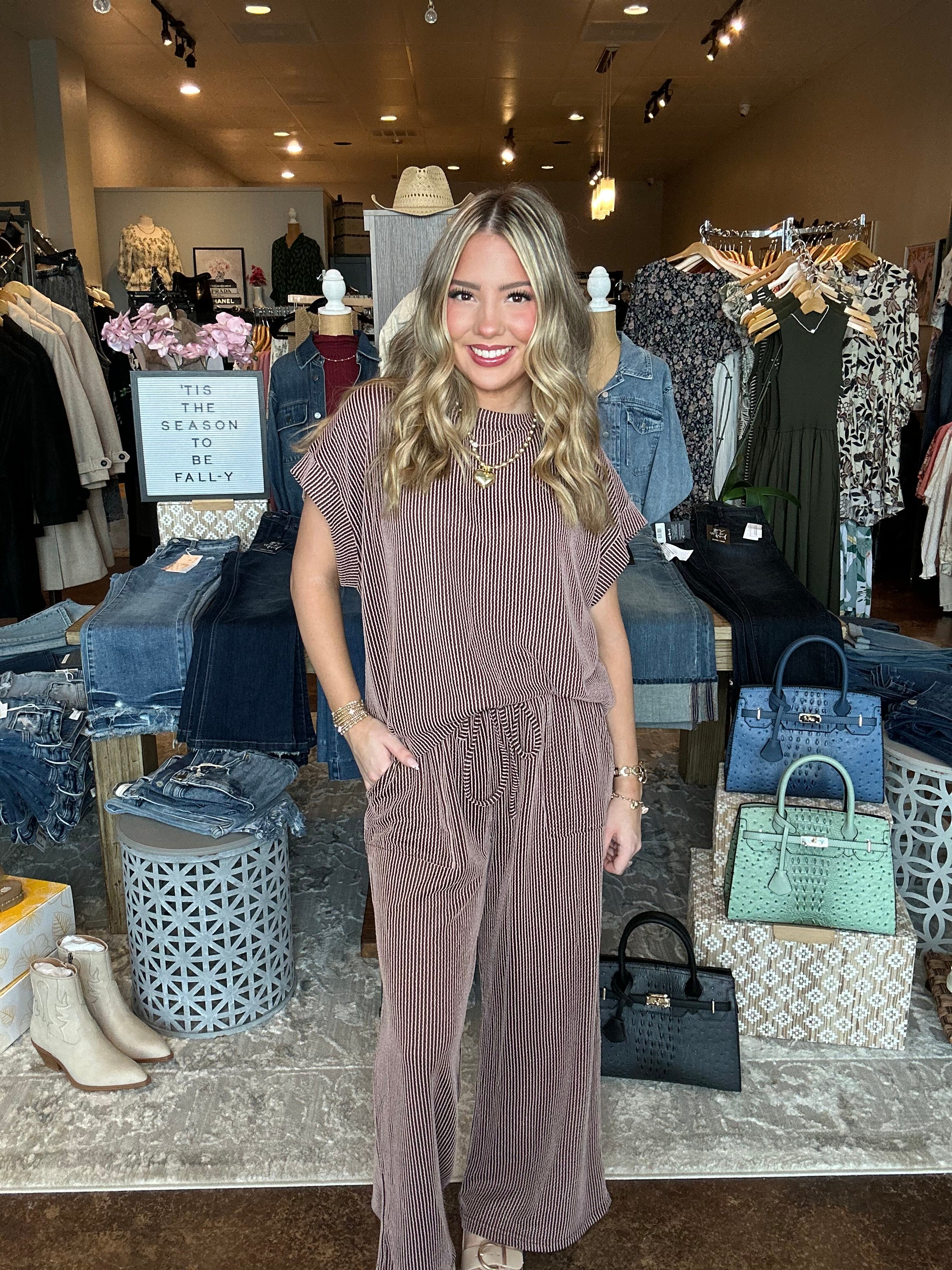 Stay effortlessly put-together without sacrificing comfort. Our two-piece Striped Rib Knit Set features a flowy, oversized top with relaxed dolman sleeves and wide-leg pants finished with a stretchy drawstring waist. The soft, vertical stripe texture adds a modern touch, while the ultra-soft fabric feels like a gentle hug. Perfect for cozy mornings, casual errands, or winding down in style—this set does it all.