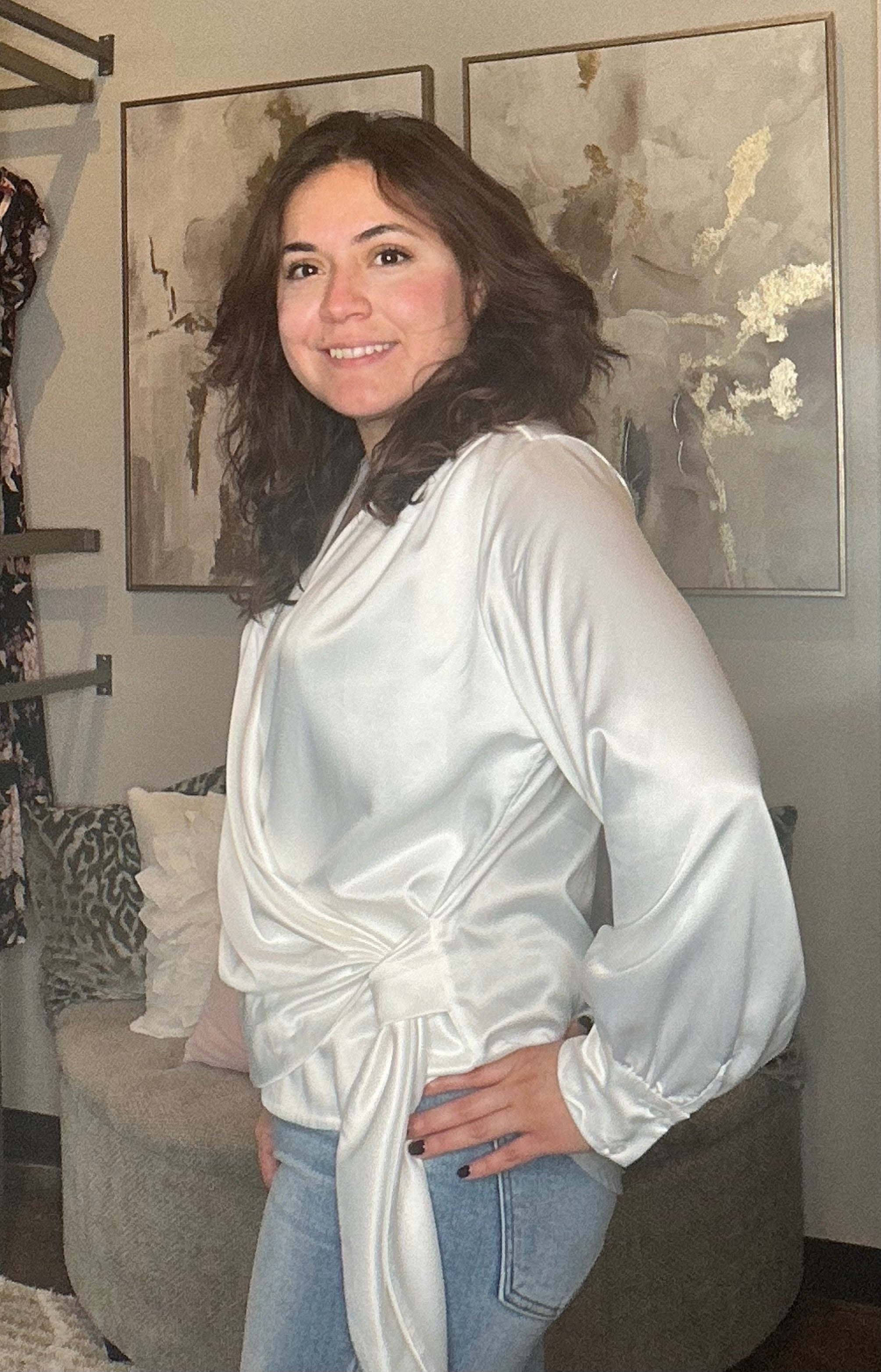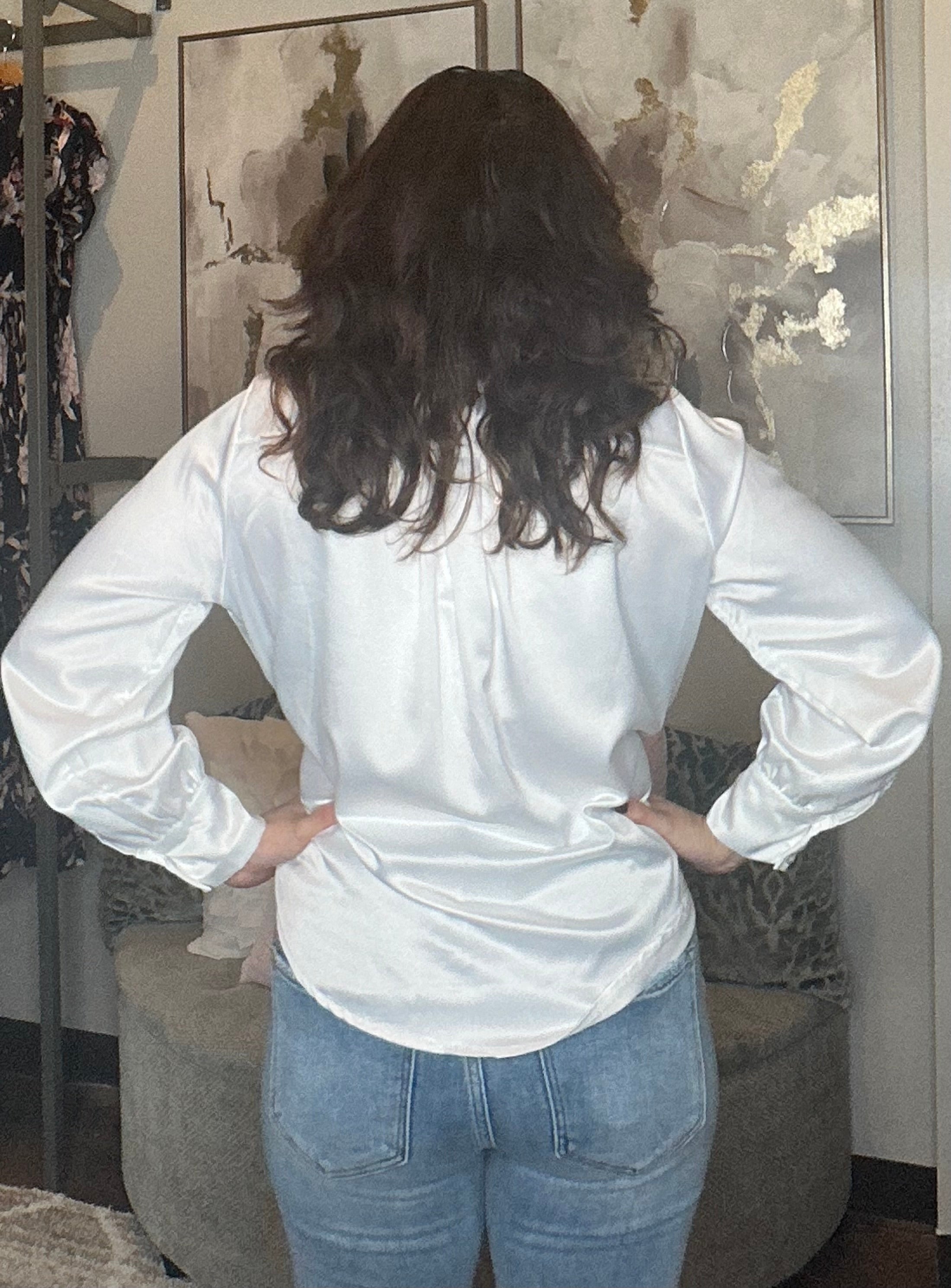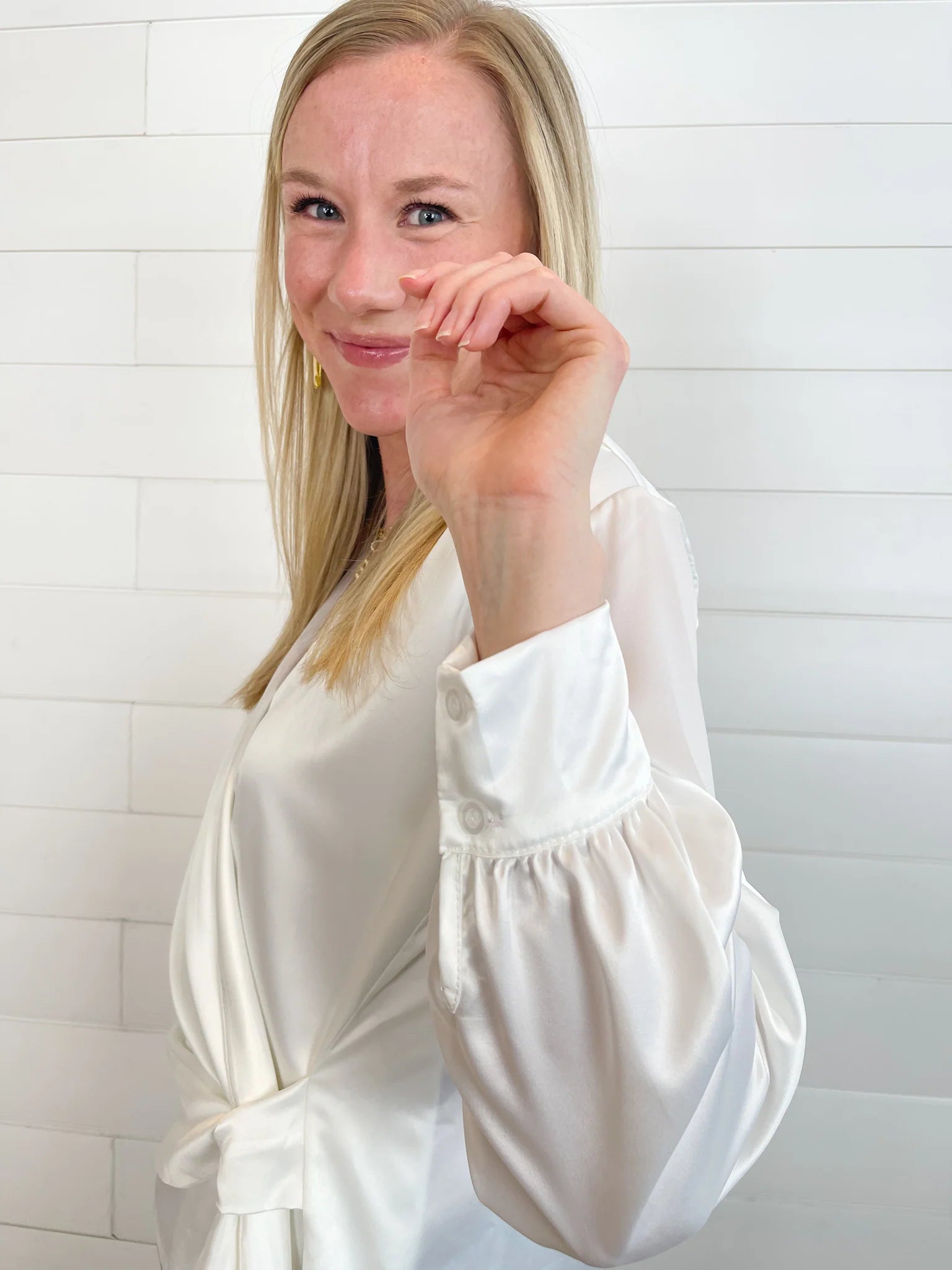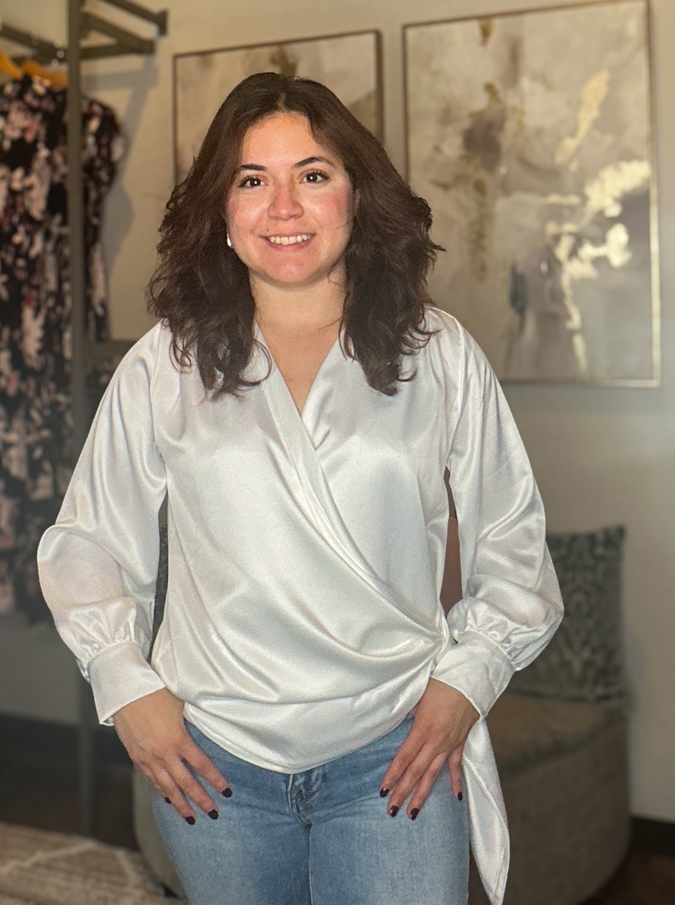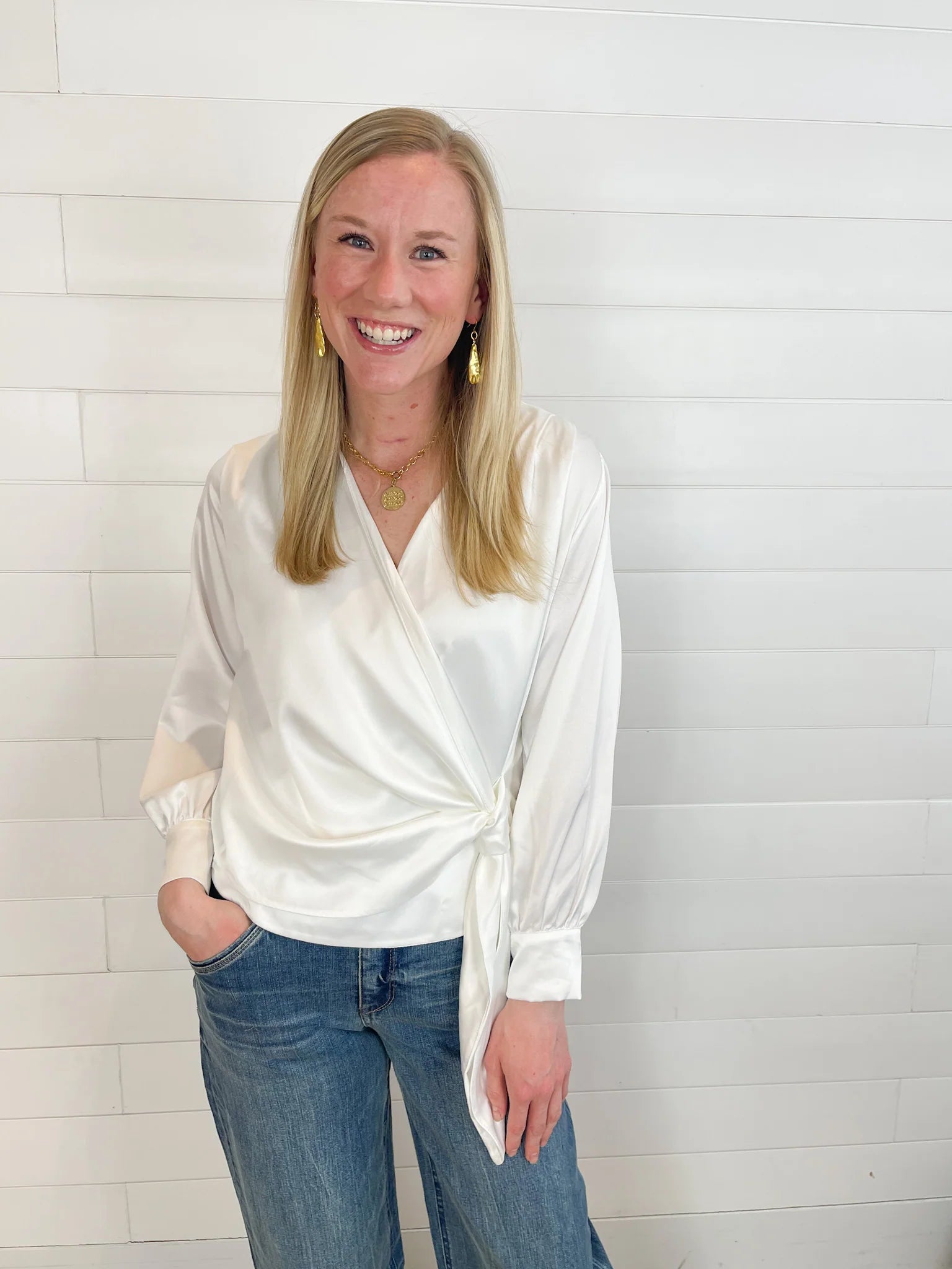 Crafted from luxurious satin, this surplice top adds a touch of elegance to any outfit. Designed to drape beautifully on the body, it flatters all shapes and sizes. Elevate your wardrobe with this versatile staple that can be dressed up or down for any occasion.
