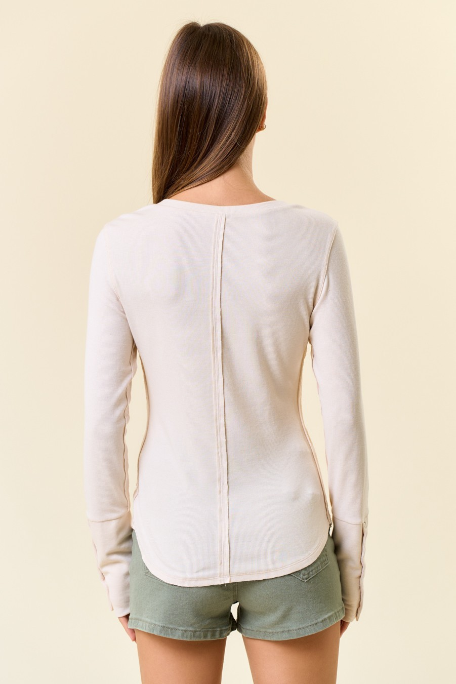 Soft Rib Exposed Seaming Long Sleeve Henley Top