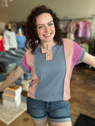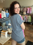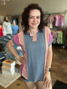 Our short sleeve Color Block Twist Rib Top features eye-catching twisted rib details, exposed seams for an edgy touch, and playful color blocking that pops. The ribbed fabric offers a comfy, flattering fit, while the nonfunctional front buttons add just the right amount of vintage flair. Perfect for elevating your everyday look with a modern, laid-back vibe.