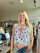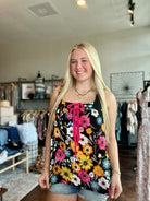 Embrace timeless femininity with this Floral Square Neck Babydoll Top With Front Ties. This exquisite piece combines classic design elements with contemporary flair, featuring a flattering square neckline with ties. The vibrant floral print is beautifully framed by color-blocked panels, creating a harmonious balance between boldness and subtlety.