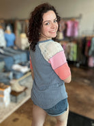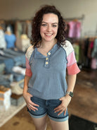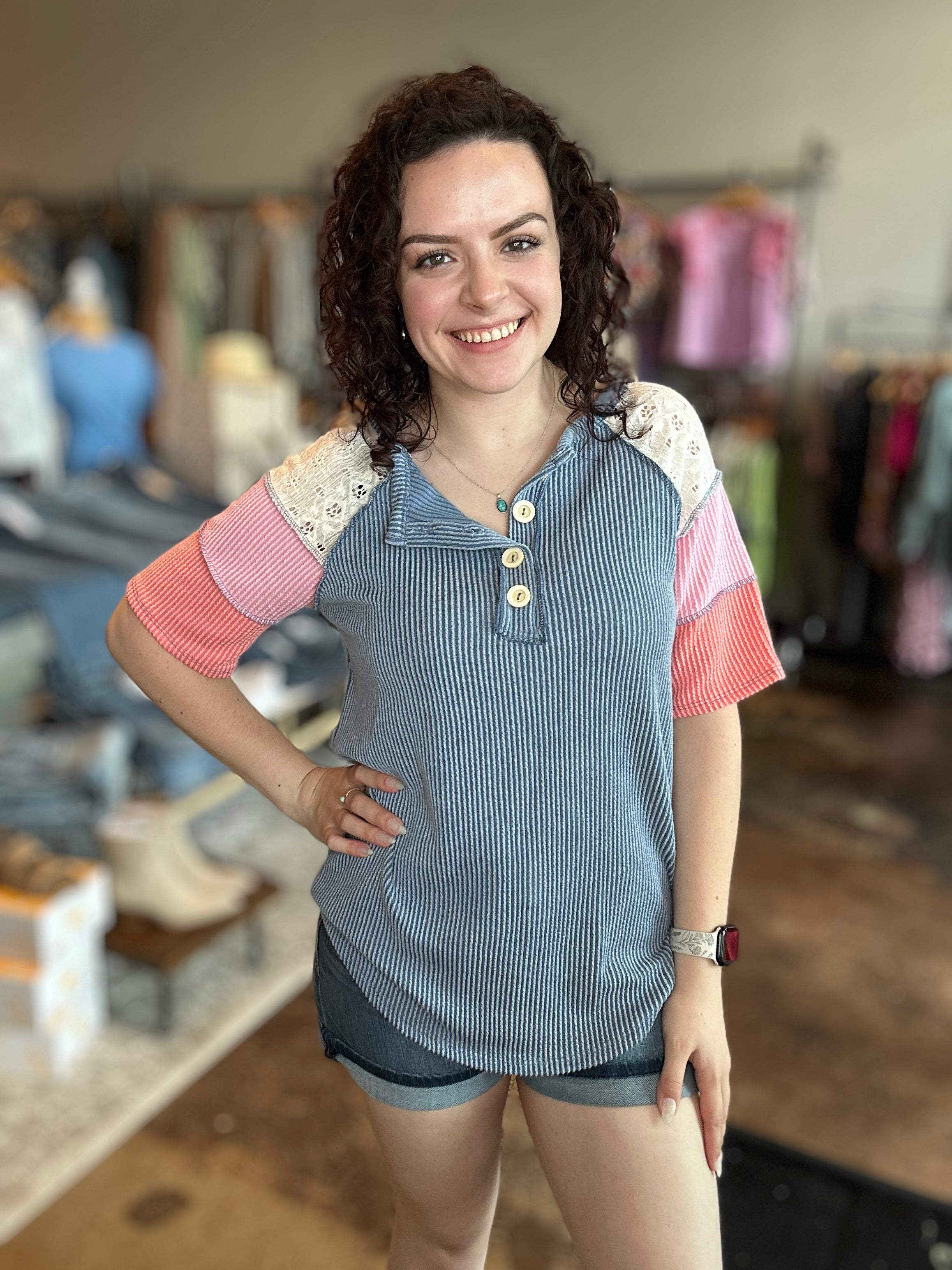 Our Ribbed Color Block Henley Top puts a stylish spin on casual with its relaxed fit, curved hem, and soft ribbed texture. Short sleeves feature eye-catching lace and patchwork accents, while exposed seams add a laid-back, lived-in vibe. Finished with a partial button front—two functional, two for flair—it’s the perfect mix of feminine and effortless.