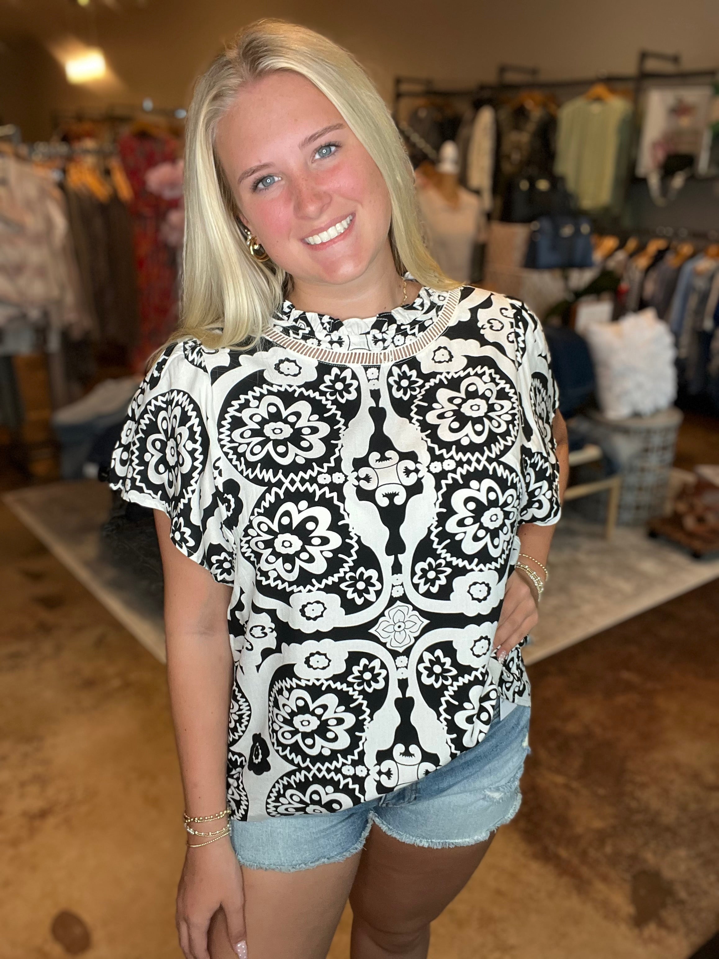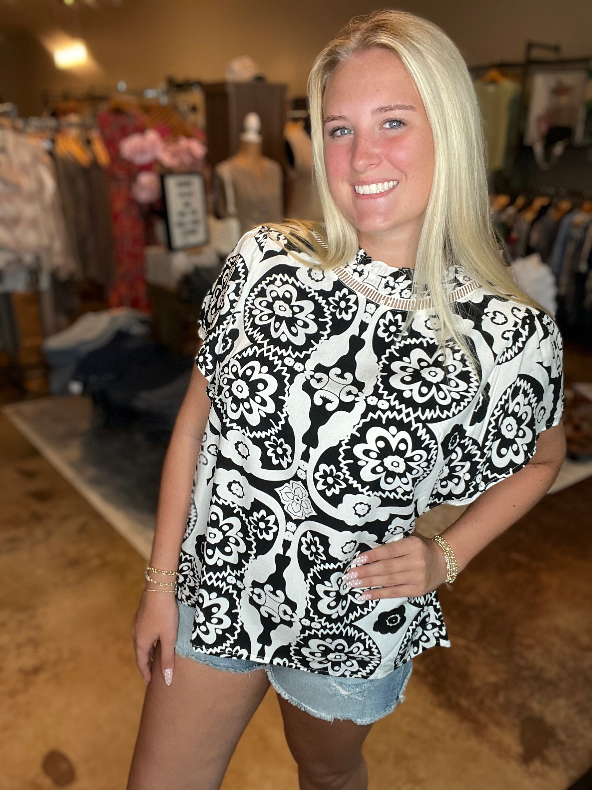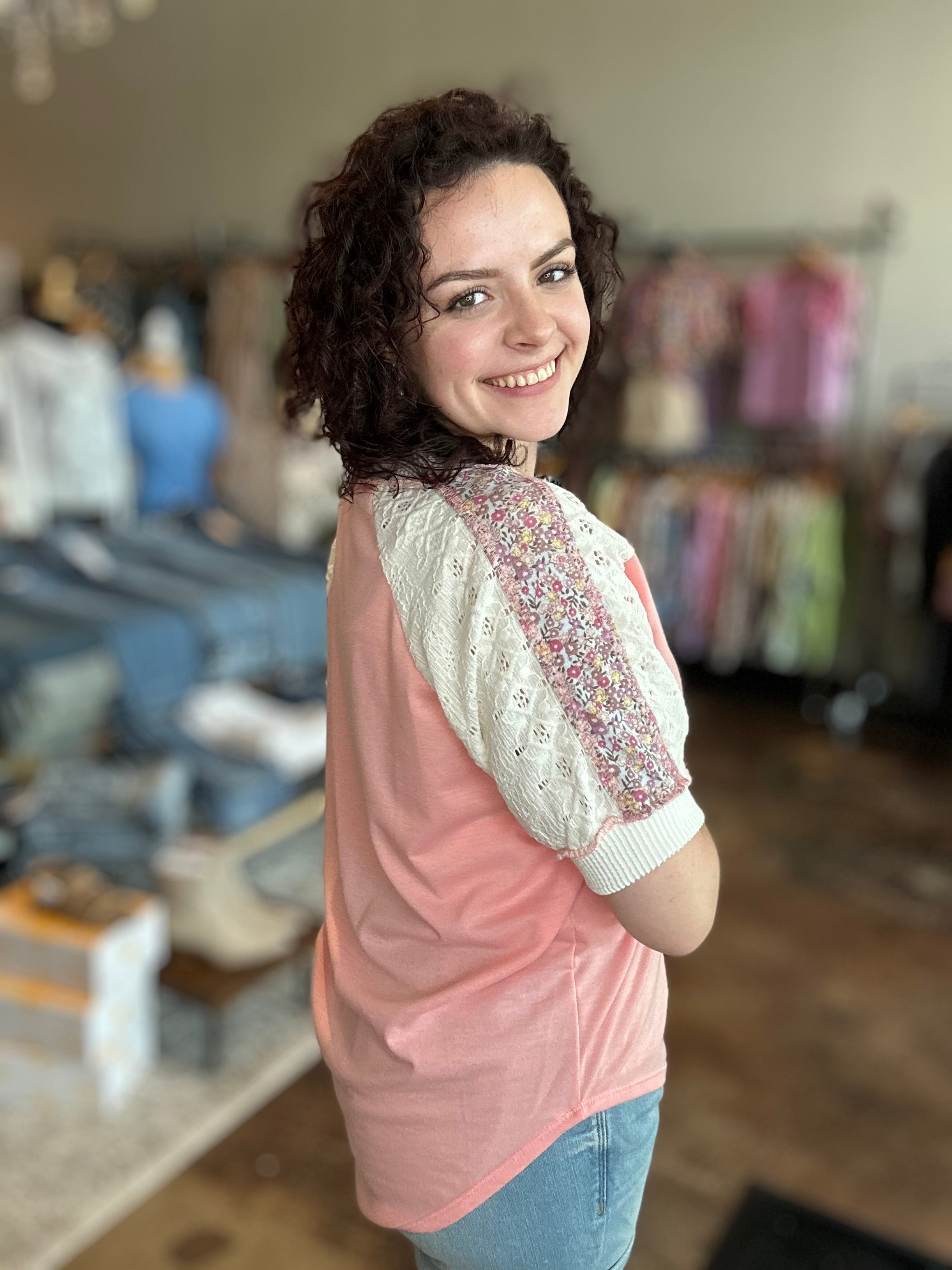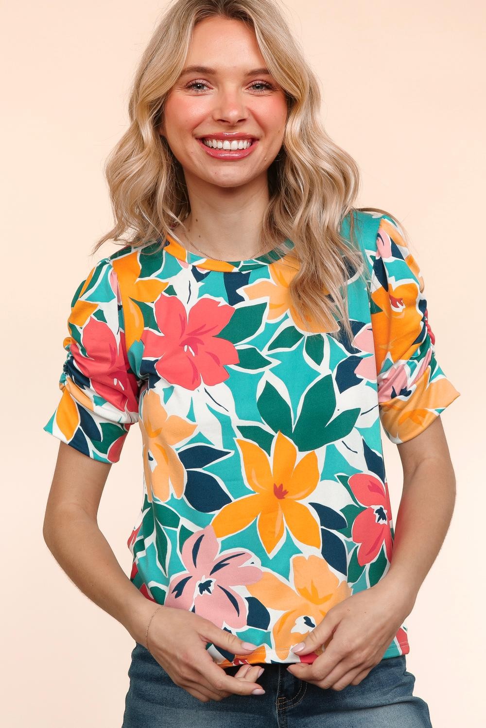 Floral Top W/ Shirring Detail Bubble Sleeve