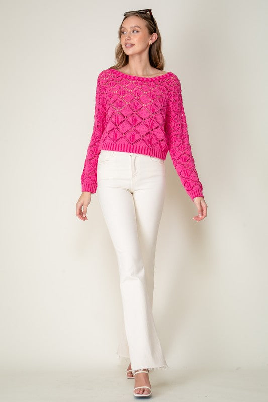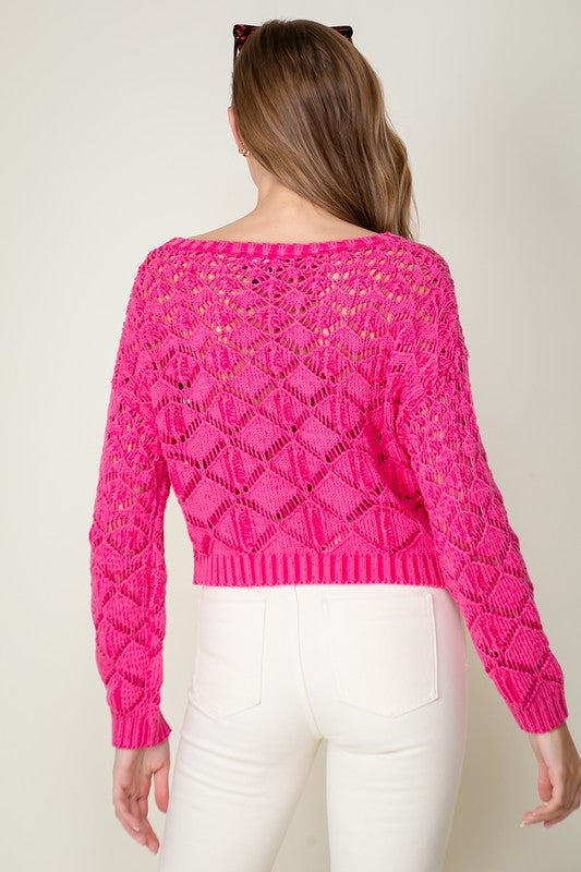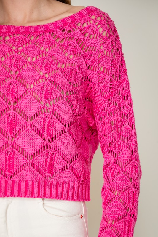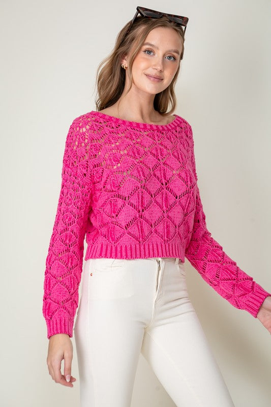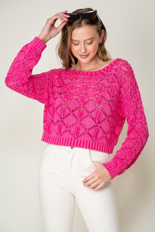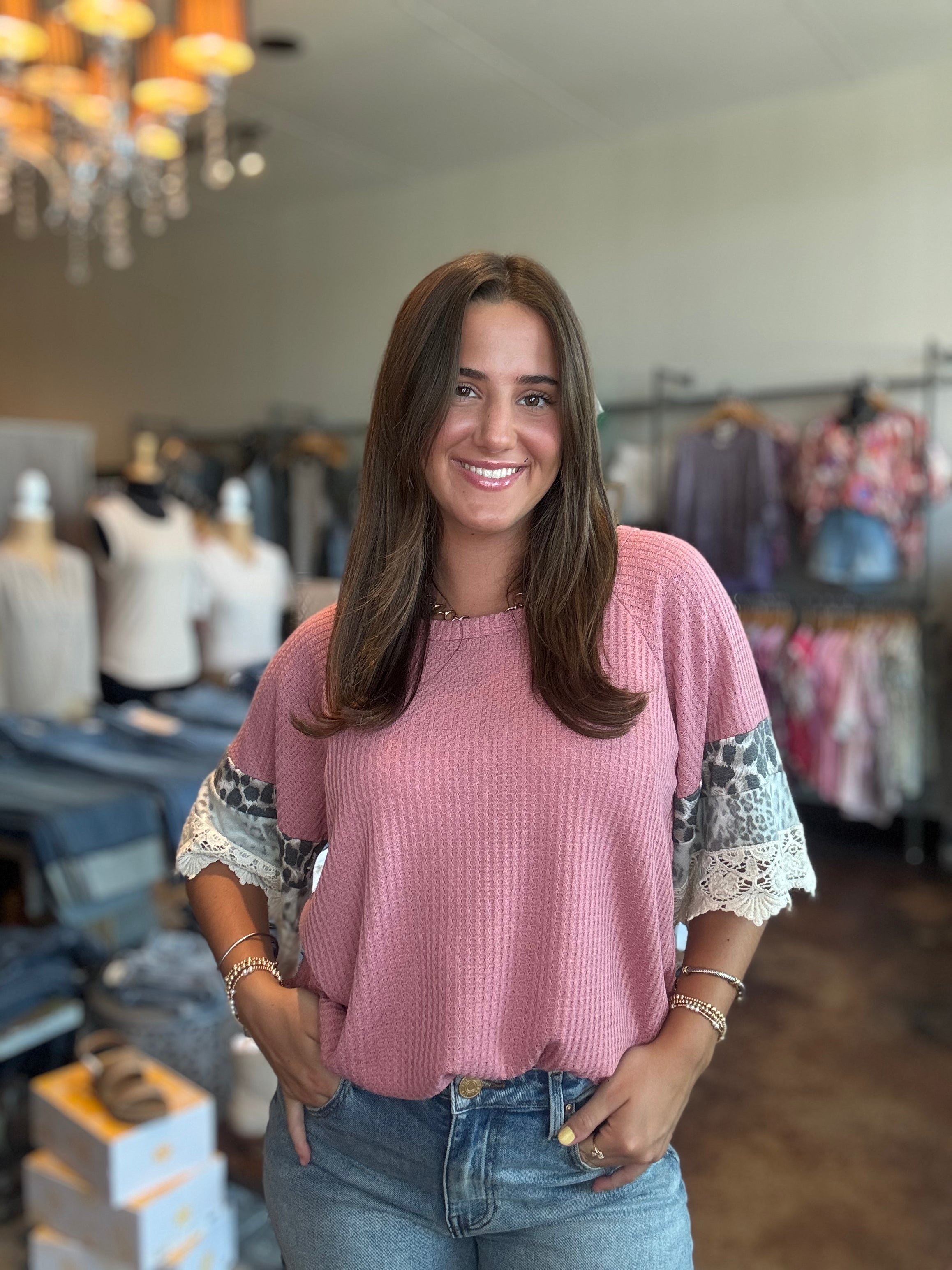 Waffle Knit Leopard Blocking Top With Crochet Lace Sleeve