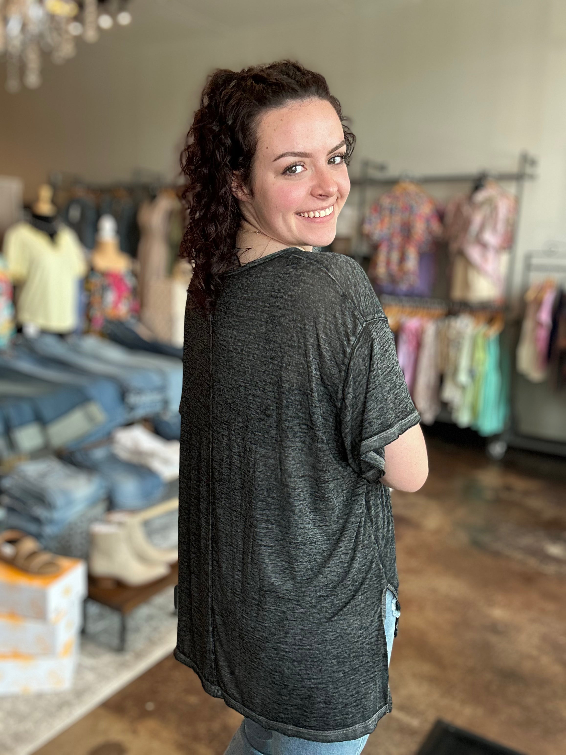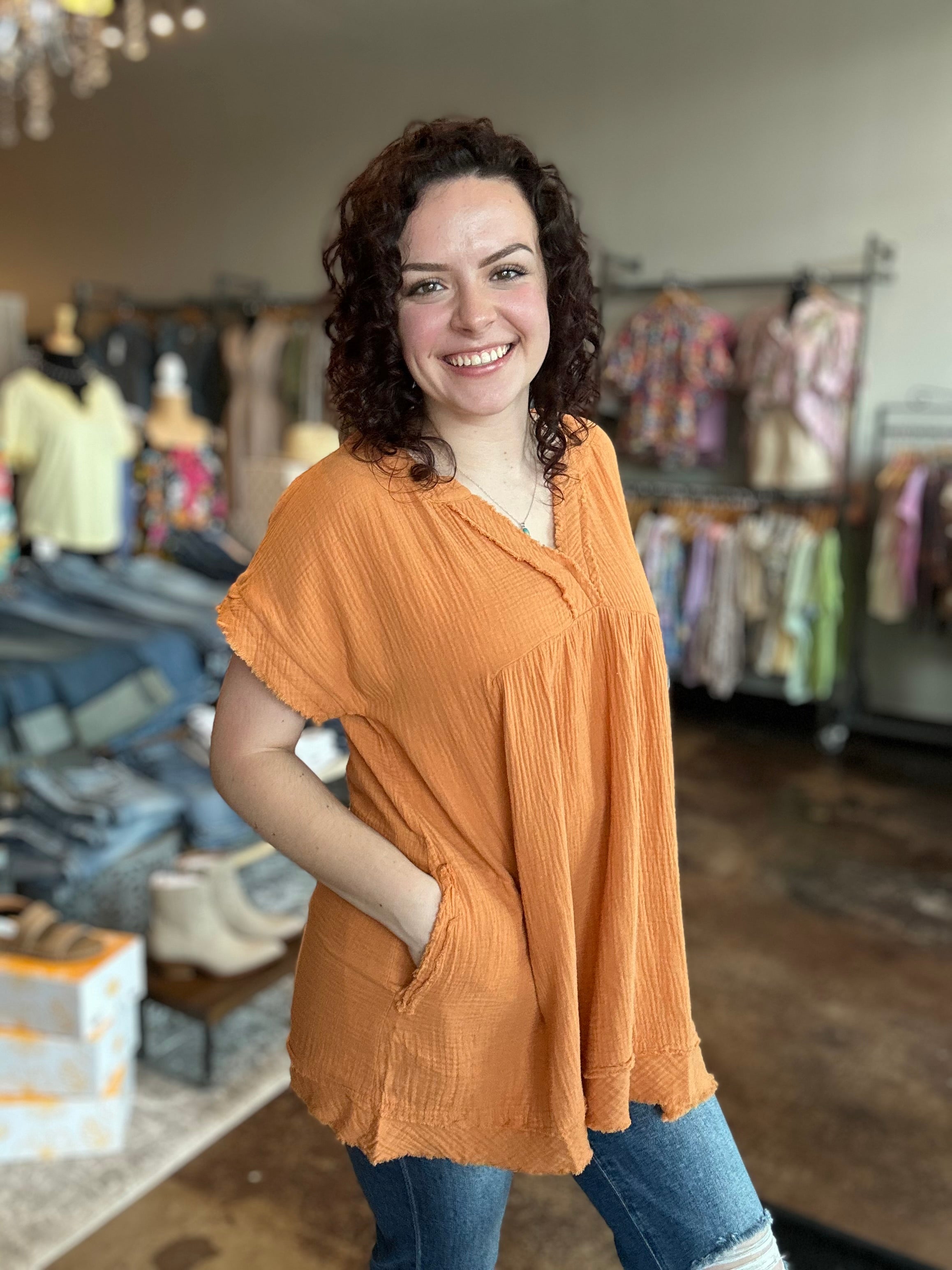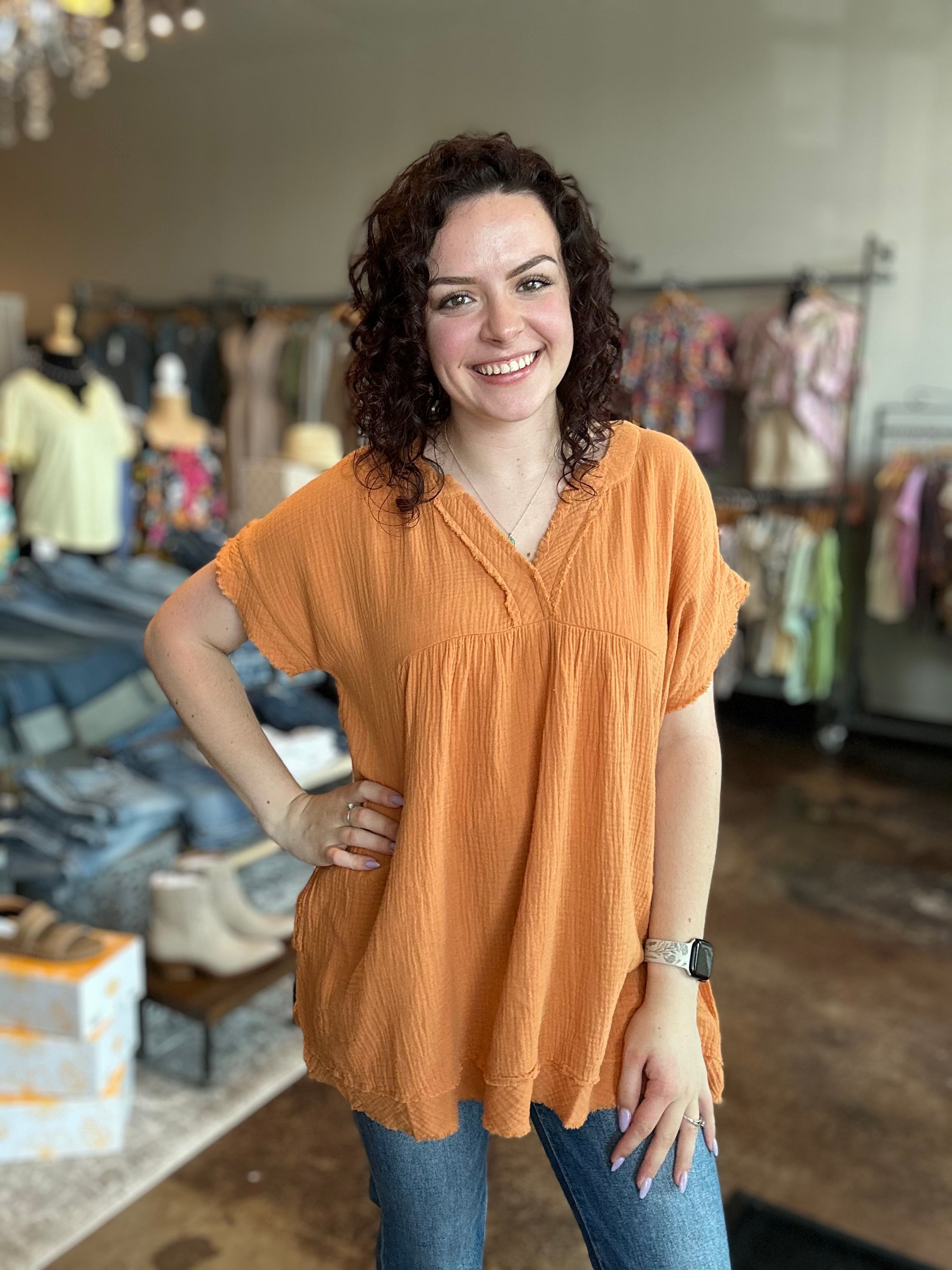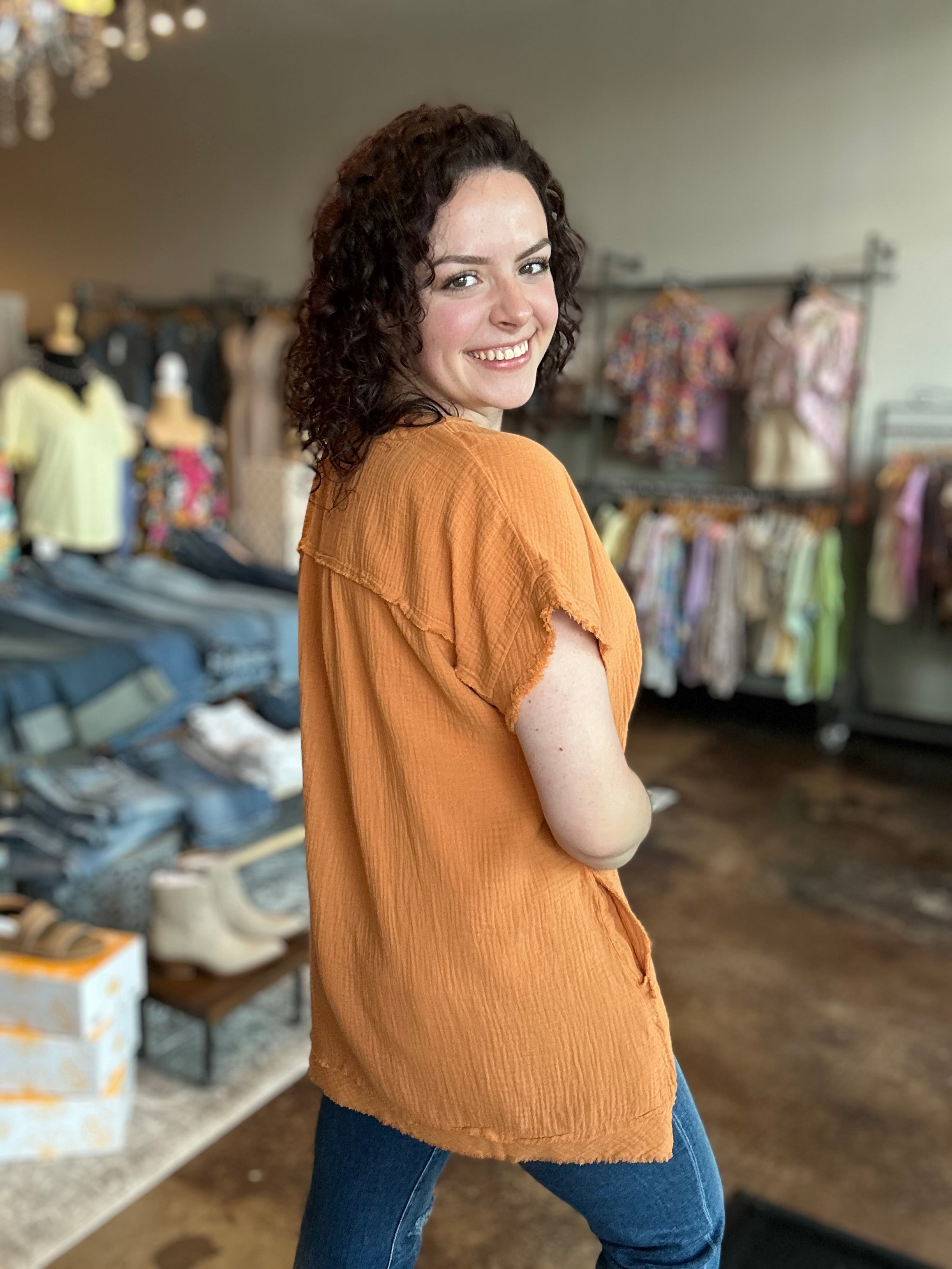 Raw Hem Short Sleeve V-Neck Gauze Top