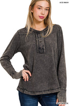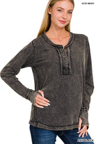 Effortlessly cool with a lived-in feel, our Acid Washed Long Sleeve Top brings comfort and edge together. Featuring a scoop neckline, raw edge detailing, and a functional partial button-front closure, it’s full of laid-back character. Thumb holes at the ribbed cuffs add a cozy touch, while the unique back patch design gives it subtle structure. Perfect for layering or lounging, this top pairs effortlessly with denim, leggings, or your favorite lounge bottoms.