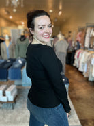 The Mac and Me Bell Sleeve Ribbed Top brings easy drama to your everyday. Designed with a flattering split neckline, it features soft variegated ribbing and standout bell sleeves for a touch of playful flair. Lightweight and versatile, it layers beautifully or shines all on its own.