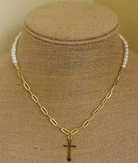 Elevate your style with the Bella Cross Chain & Freshwater Pearls necklace. Featuring delicate freshwater pearls and a charming cross chain, this necklace adds a touch of elegance to any outfit. Made with high-quality materials, this necklace is sure to become a staple in your jewelry collection. Luxurious and timeless, it's perfect for any occasion.