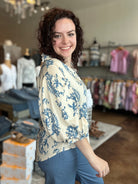 Effortlessly elegant with a touch of bohemian charm, this is your go-to piece for soft sophistication. Crafted from a breathable, lightweight fabric, this off-white blouse features an intricate blue pattern that evokes coastal serenity. The flattering button-down front is complemented by romantic 3/4 balloon sleeves, gently cinched at the cuffs for a tailored finish. Whether tucked into high-waisted trousers or worn loose over denim, this blouse transitions seamlessly from daytime ease to evening allure.