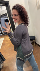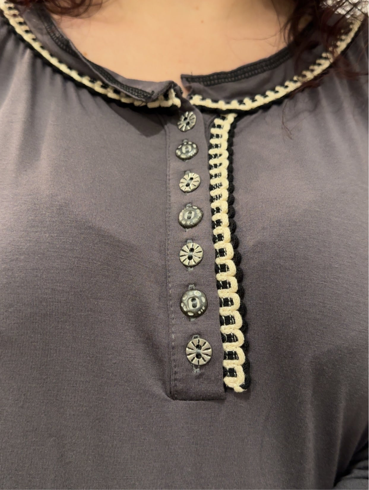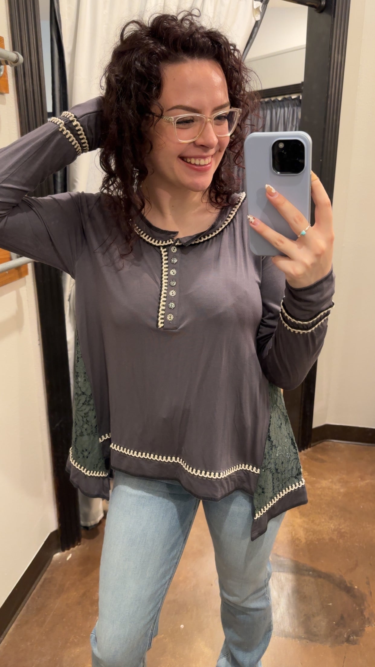 Elevate your everyday with our Button Long Sleeve Top With Lace Panels—a refined blend of texture, detail, and comfort. This soft grey long sleeve features a 1/4 button-up neckline, gently accented with delicate embroidery that traces the collar, cuffs, and just above the hemline for a timeless, artisan feel.