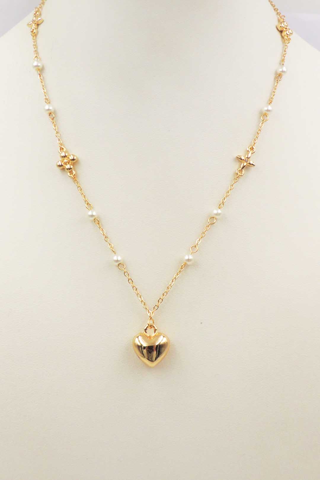 Elevate your collection with this Clover And Pearl Beaded Necklace With Heart Pendant, a refined 16–18″ adjustable piece crafted on a gold‑plated chain dotted with faux pearls and delicate clover charms, culminating in a gold heart pendant. The balance of pearlescent texture and shimmering gold creates a look that’s at once elegant and playful. Designed to layer beautifully or stand on its own, it symbolizes luck, love, and timeless style—a subtle, meaningful accent to any outfit.