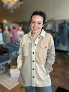 Elevate your layering game with our Color Block Shacket, where cozy comfort meets everyday style. Designed with a relaxed fit and soft, brushed fabric, this versatile piece features a classic button-down front, roomy side pockets, and buttoned chest pockets for added utility. The neutral-toned color blocking adds a modern twist, making it easy to pair with everything from denim to leggings. Perfect for those crisp days when you want warmth without sacrificing style.