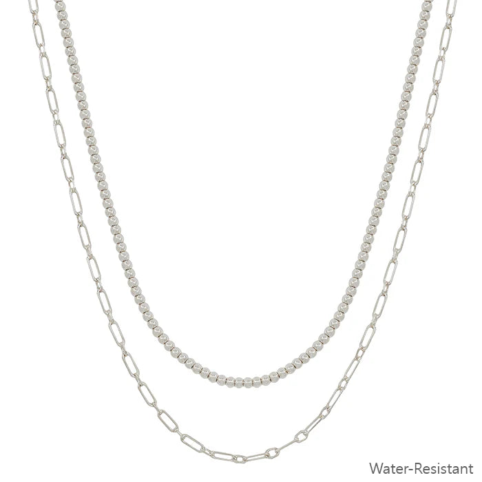 Discover refined simplicity with this two-layer necklace that combines a fine chain with a second strand dotted in delicate silver beads. The adjustable length from 16″ to 18″ lets it rest just below the collarbone, perfect for layering or wearing solo. With a water-resistant finish, this necklace brings subtle texture and understated shine to casual and dressier looks alike.