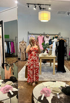 Escape to paradise with this dress, where tropical prints meet impeccable design. The flattering bandeau halter silhouette features a center tie detail and smocked back that adapts to your curves. Worry-free support comes from secure silicone gripper tape and adjustable halter straps, making this body-skimming midi the ultimate summer essential you won't want to take off. Perfect for beachside brunches or sunset cocktails.