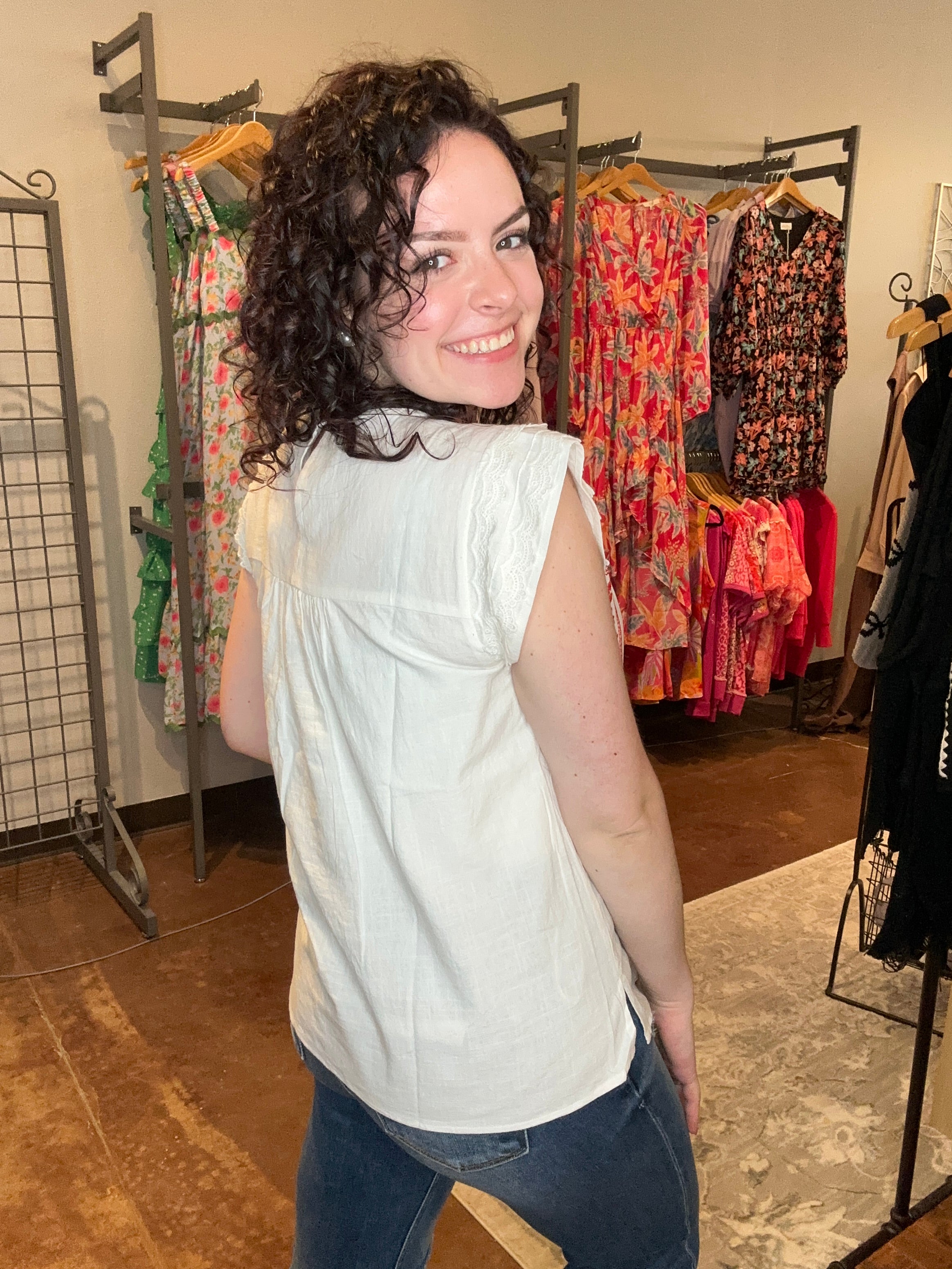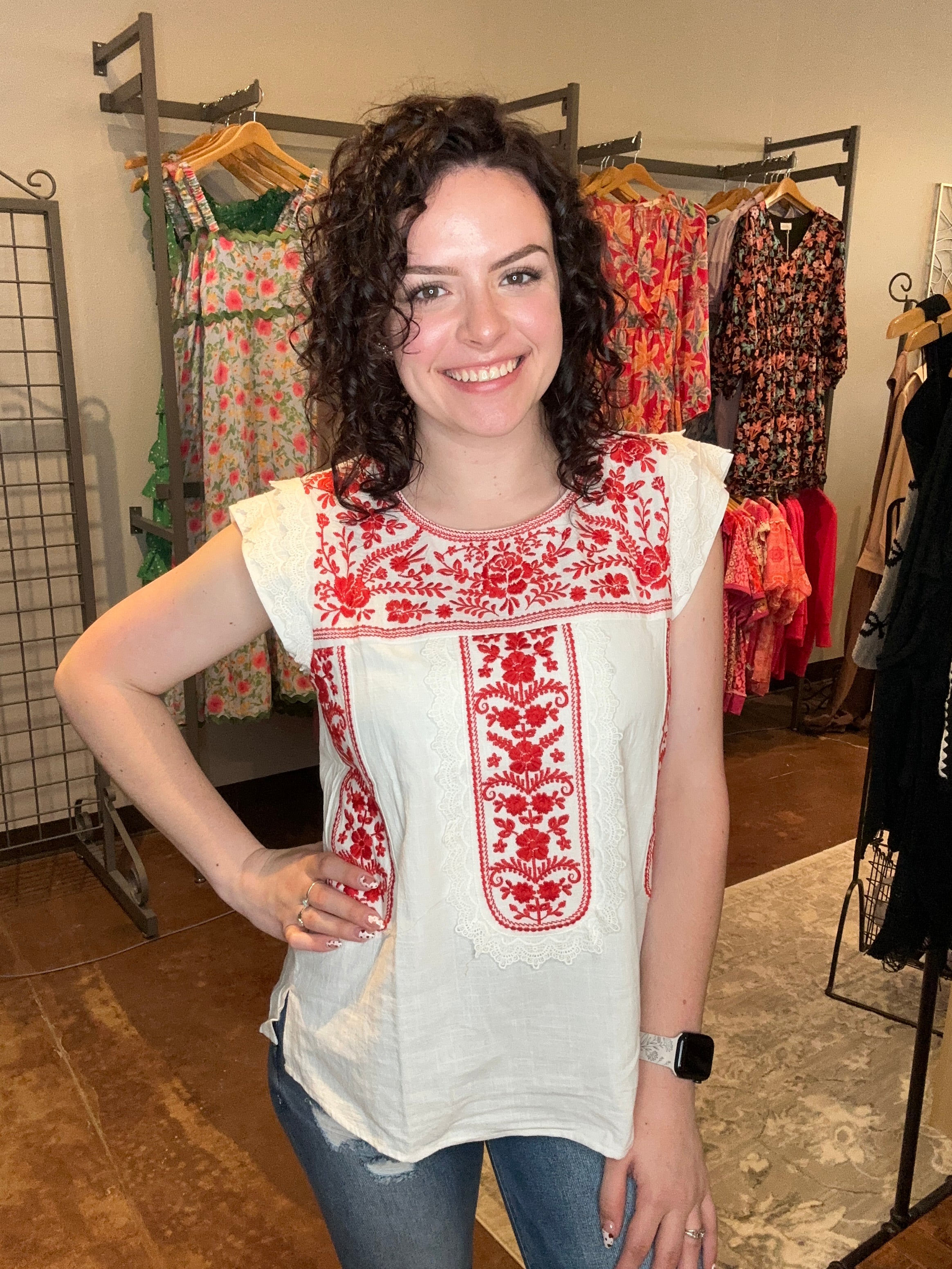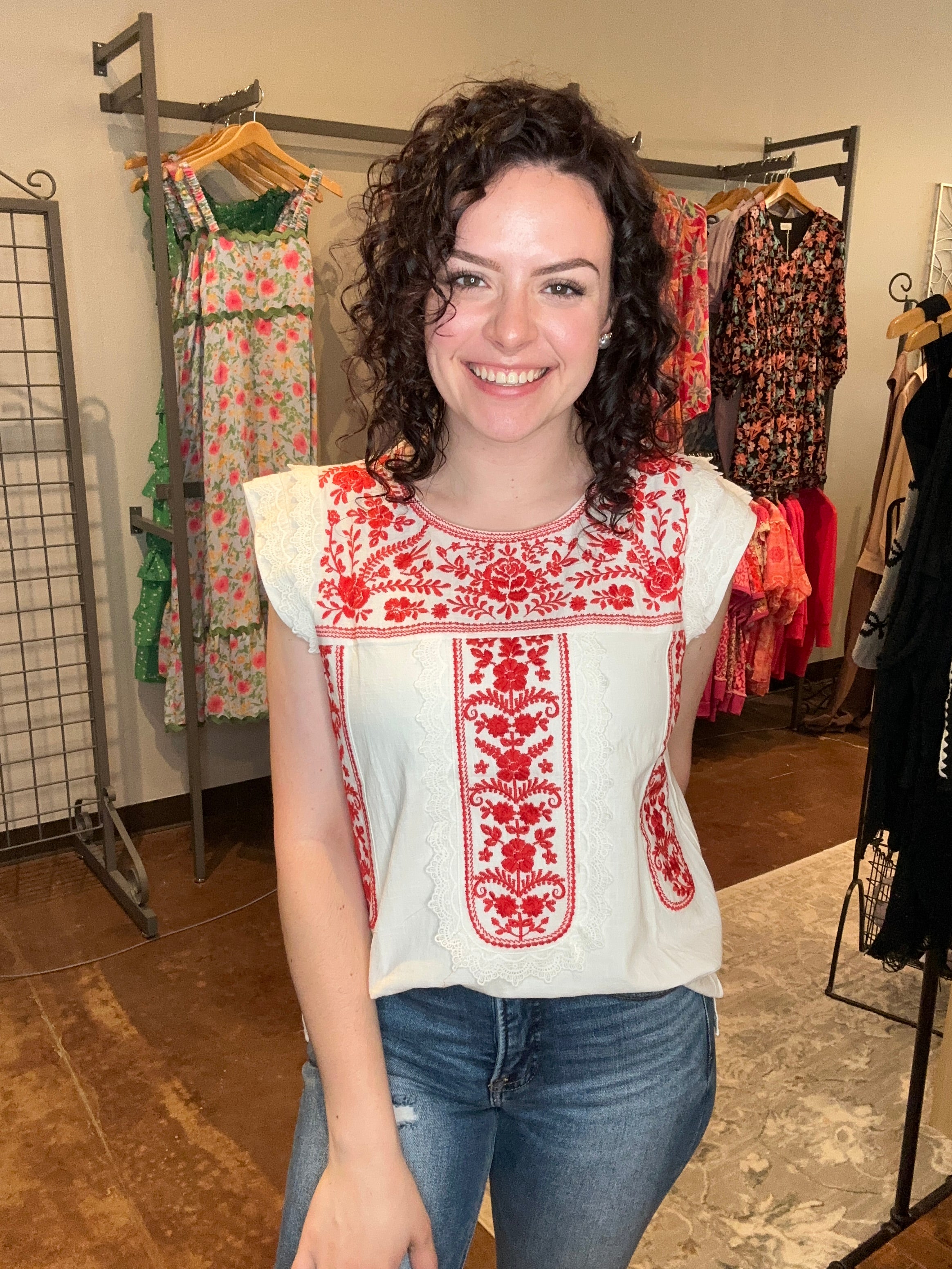 Embroidered top featuring lace details dolman sleeves and a round neckline. Simple and chic perfect to pair with your favorite jeans.