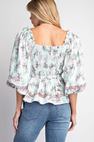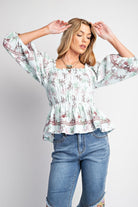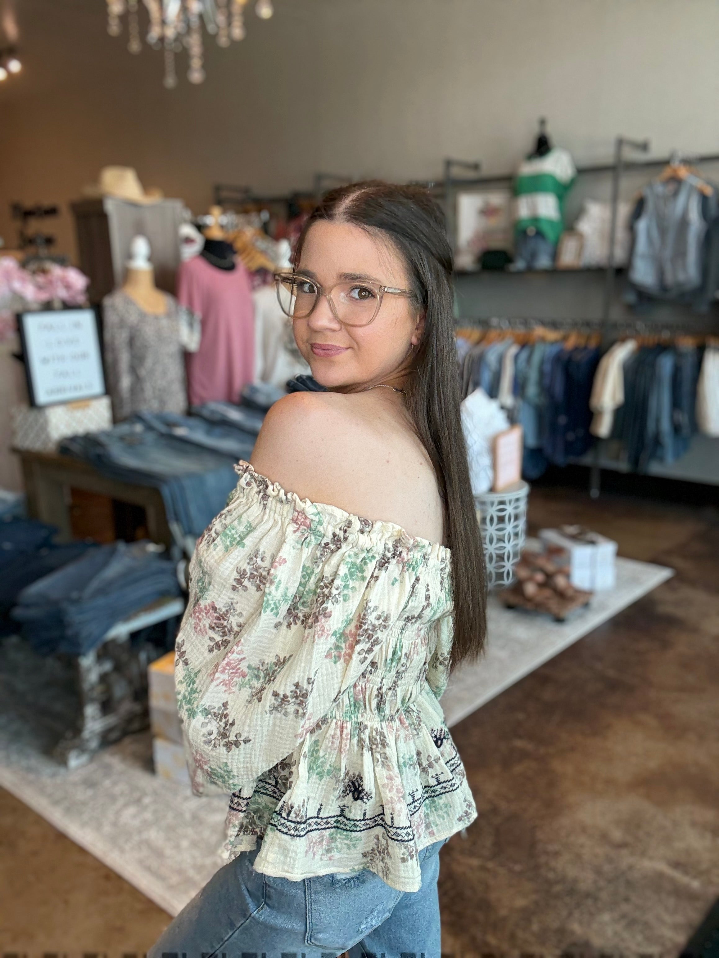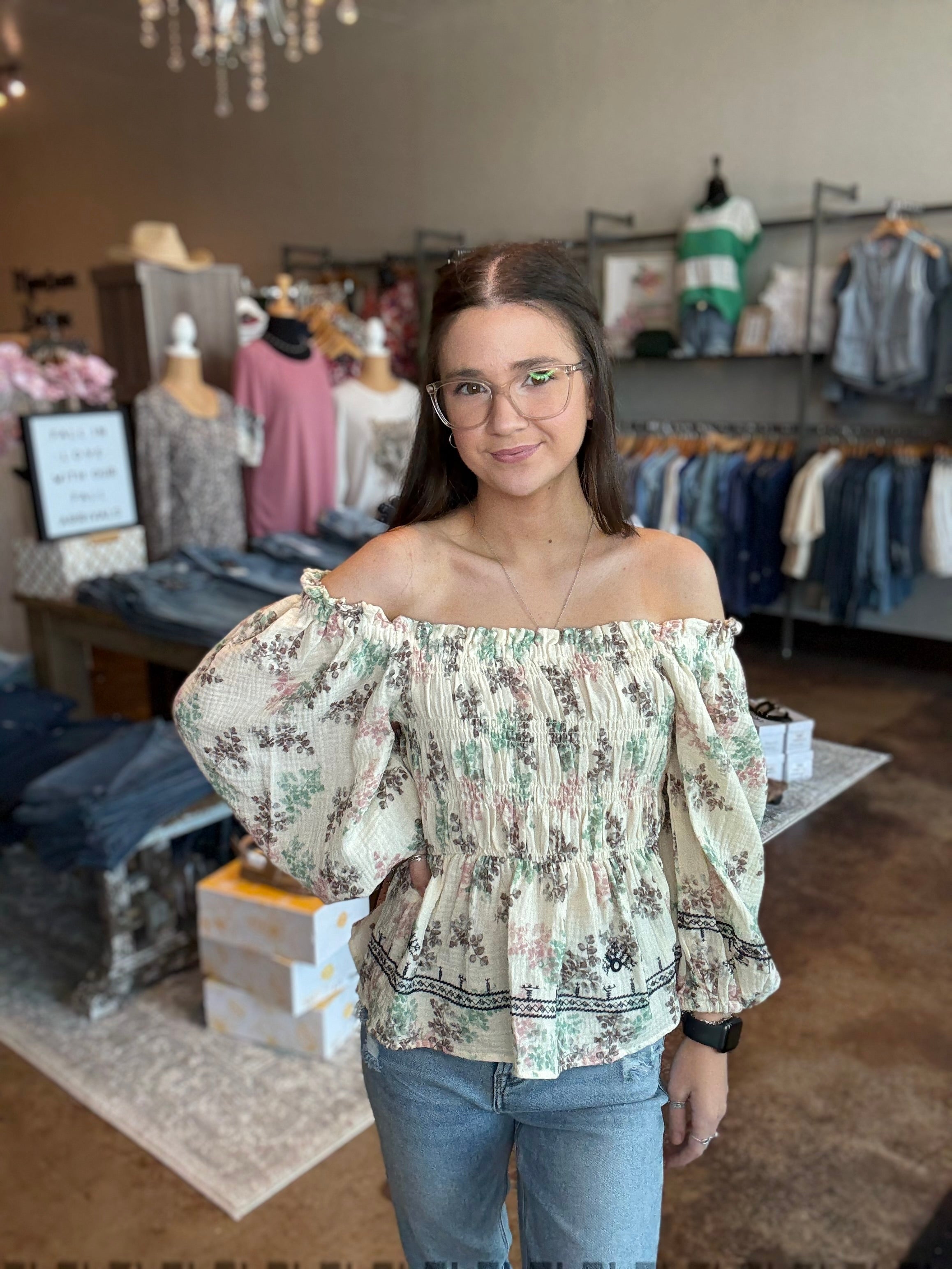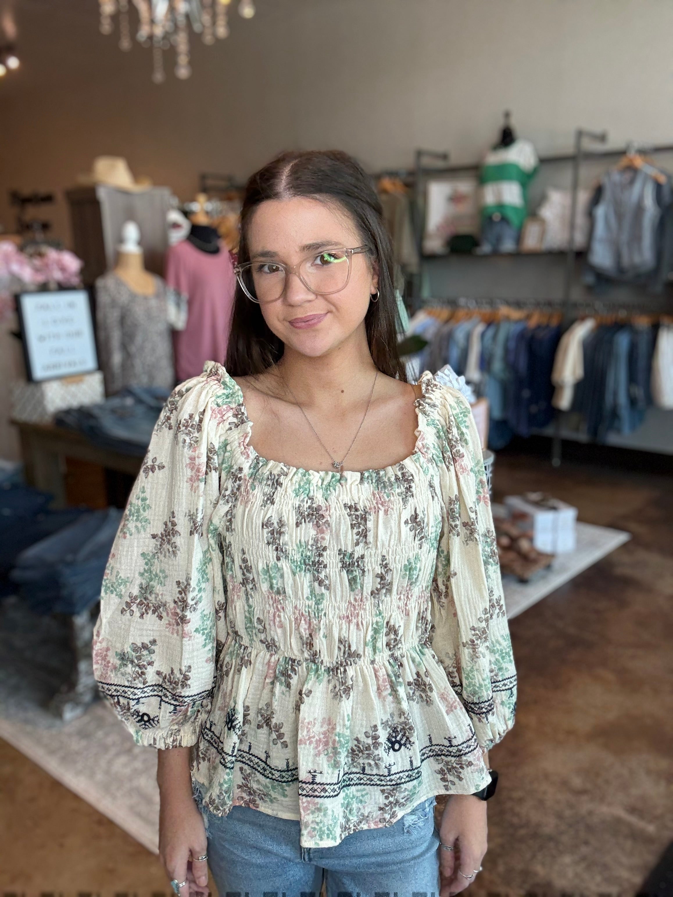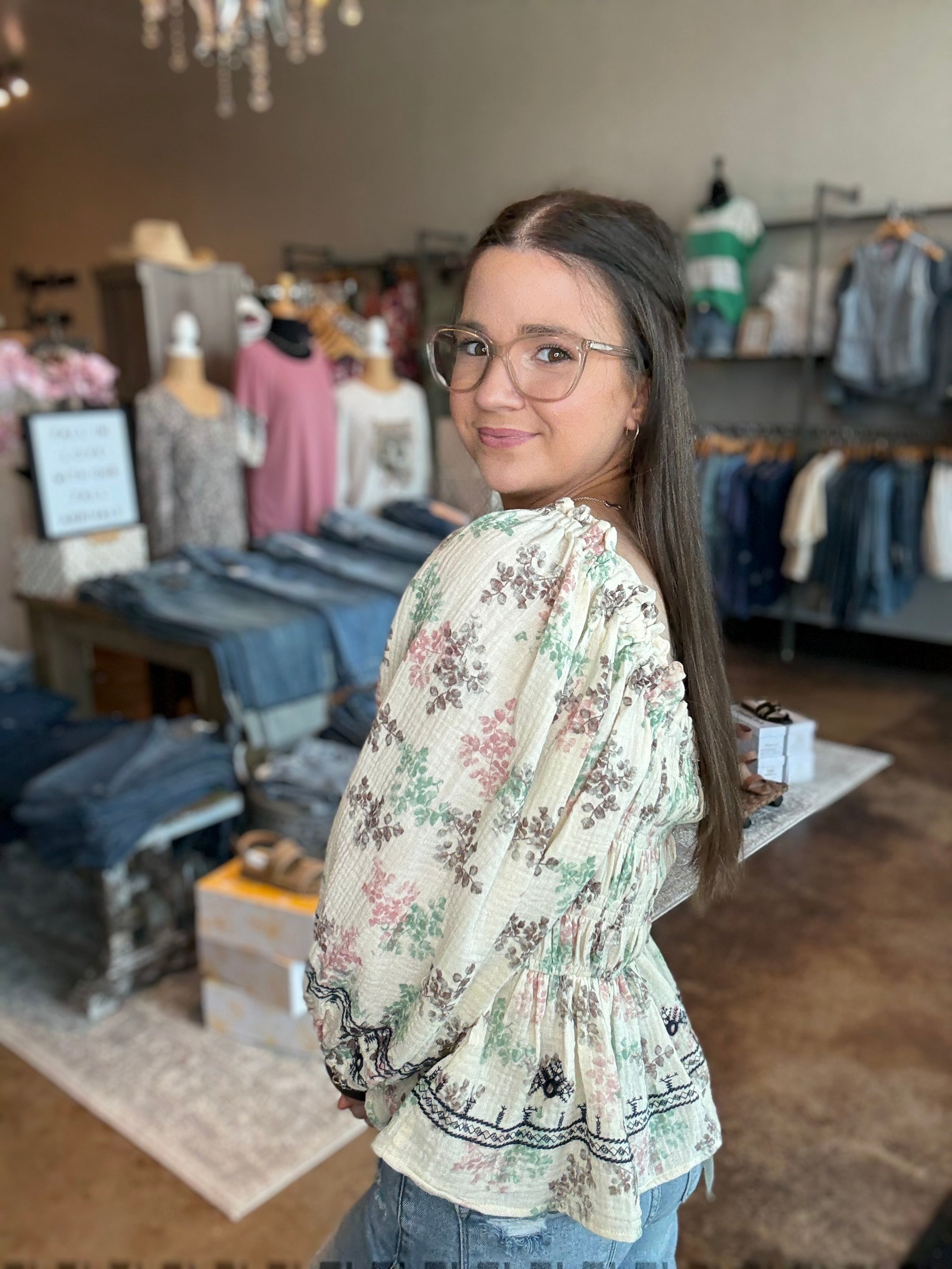 Effortless elegance meets cozy charm in our Floral Print Gauze Top. With a flattering square neckline, smocked bodice, and flared hem, it gracefully draws the eye while offering a softly defined silhouette. The balloon sleeves, gently gathered into relaxed cuffs, add a dreamy, fluid movement that's both whimsical and feminine. Crafted from breathable cotton gauze, this relaxed, easy pullover piece features delicate embroidered touches throughout, elevating its boho-chic aesthetic.
