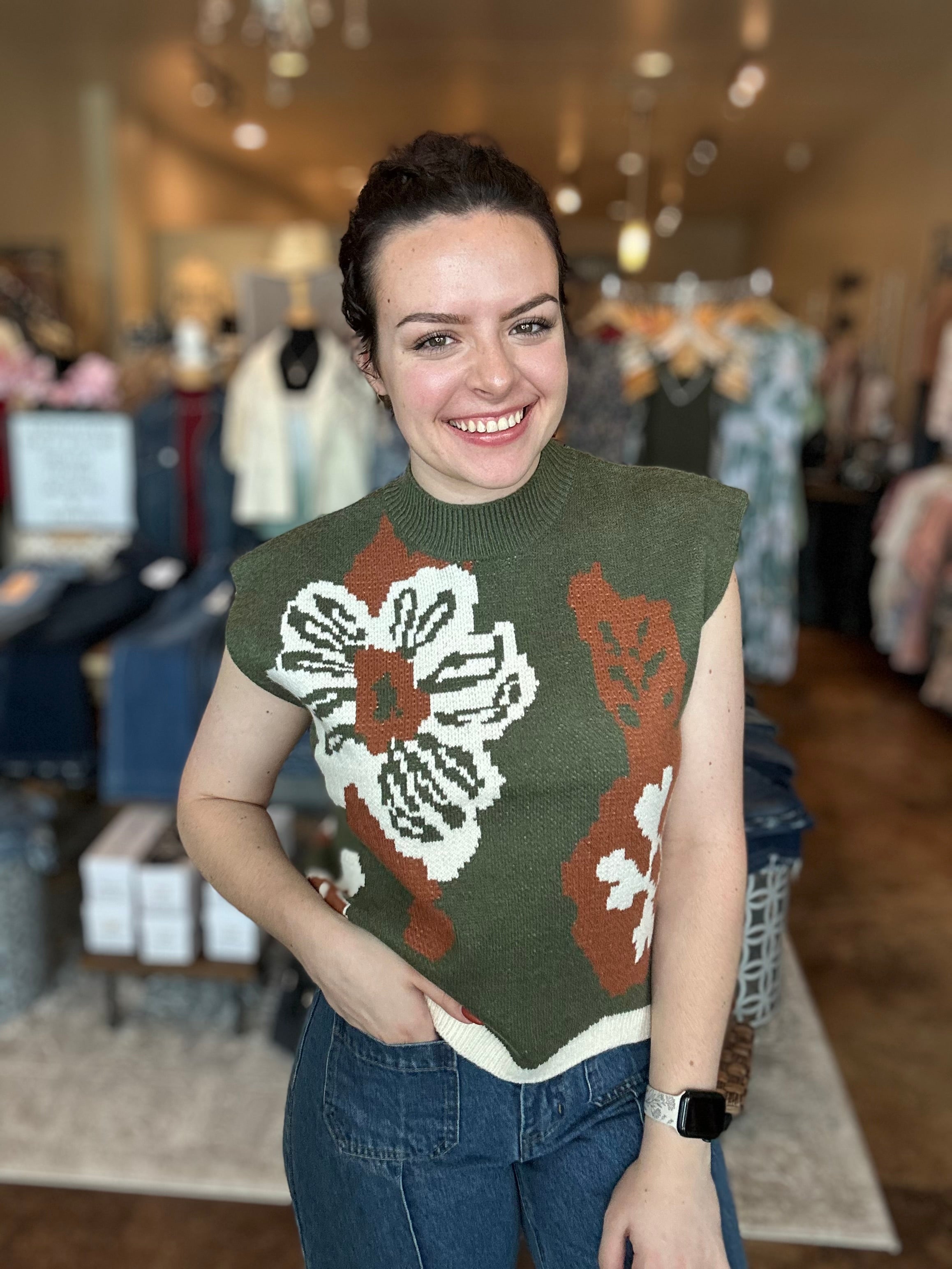 Add a playful touch to your fall wardrobe with our Floral Sleeveless Sweater Top. Featuring bold statement blooms in earthy tones, this piece pairs cozy sweater knit with a lightweight sleeveless design for easy layering. The wavy hem adds a fun, feminine finish that makes this top stand out whether styled with denim, skirts, or layered under a jacket.