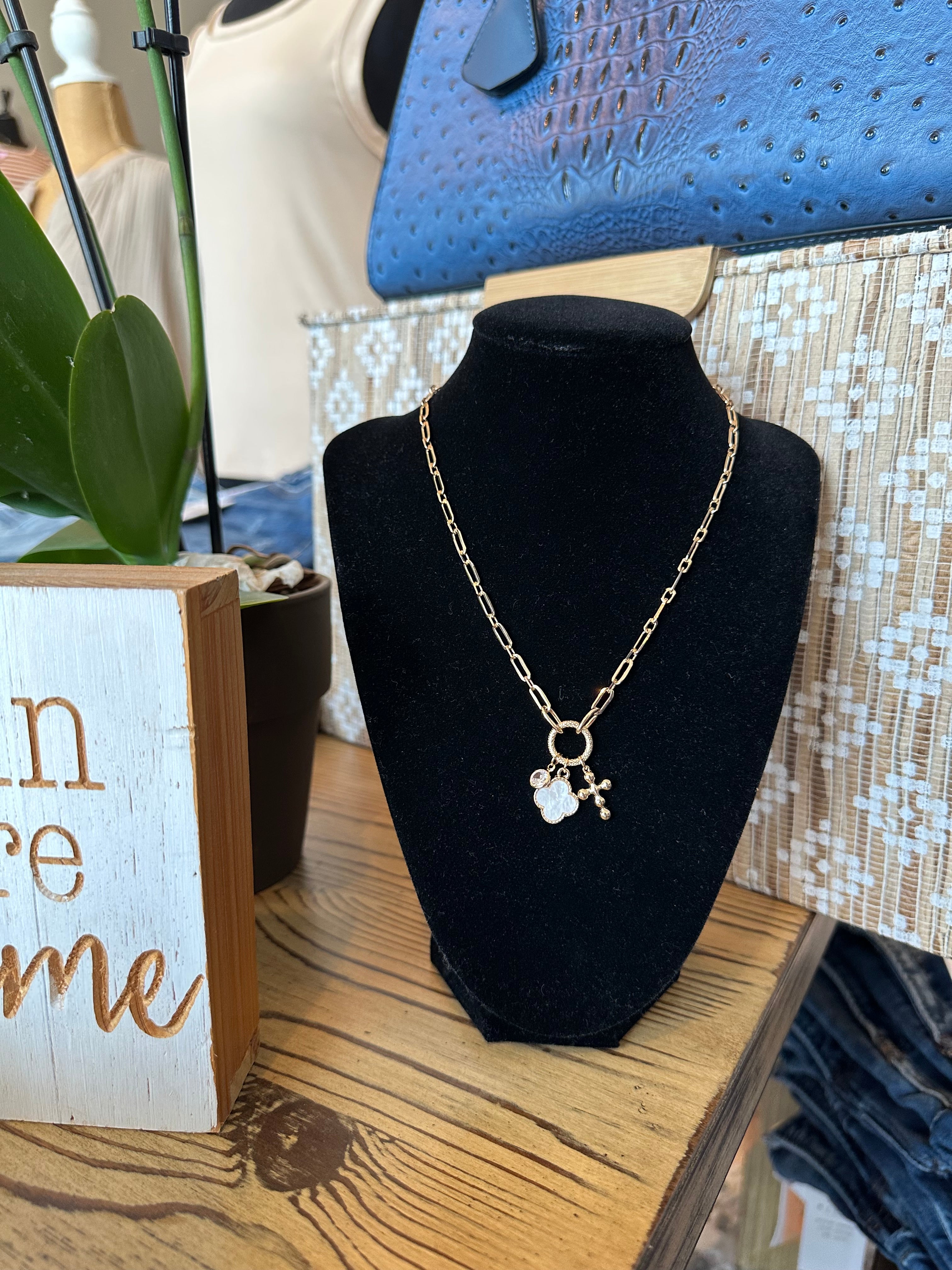 Bring charm and shine to any ensemble with this playful gold-tone necklace, featuring three versatile motifs—a clover symbol, sparkling crystal pendant, and minimalist cross—artistically spaced along a fine, adjustable chain that ranges from 16″ to 18″. The mix of symbols delivers a balanced blend of style, symbolism, and sparkle. A thoughtful blend of luck, faith, and sparkle—this piece is perfect as a standout addition to your own curated collection, engineered to stay polished and poised through everyday moments.