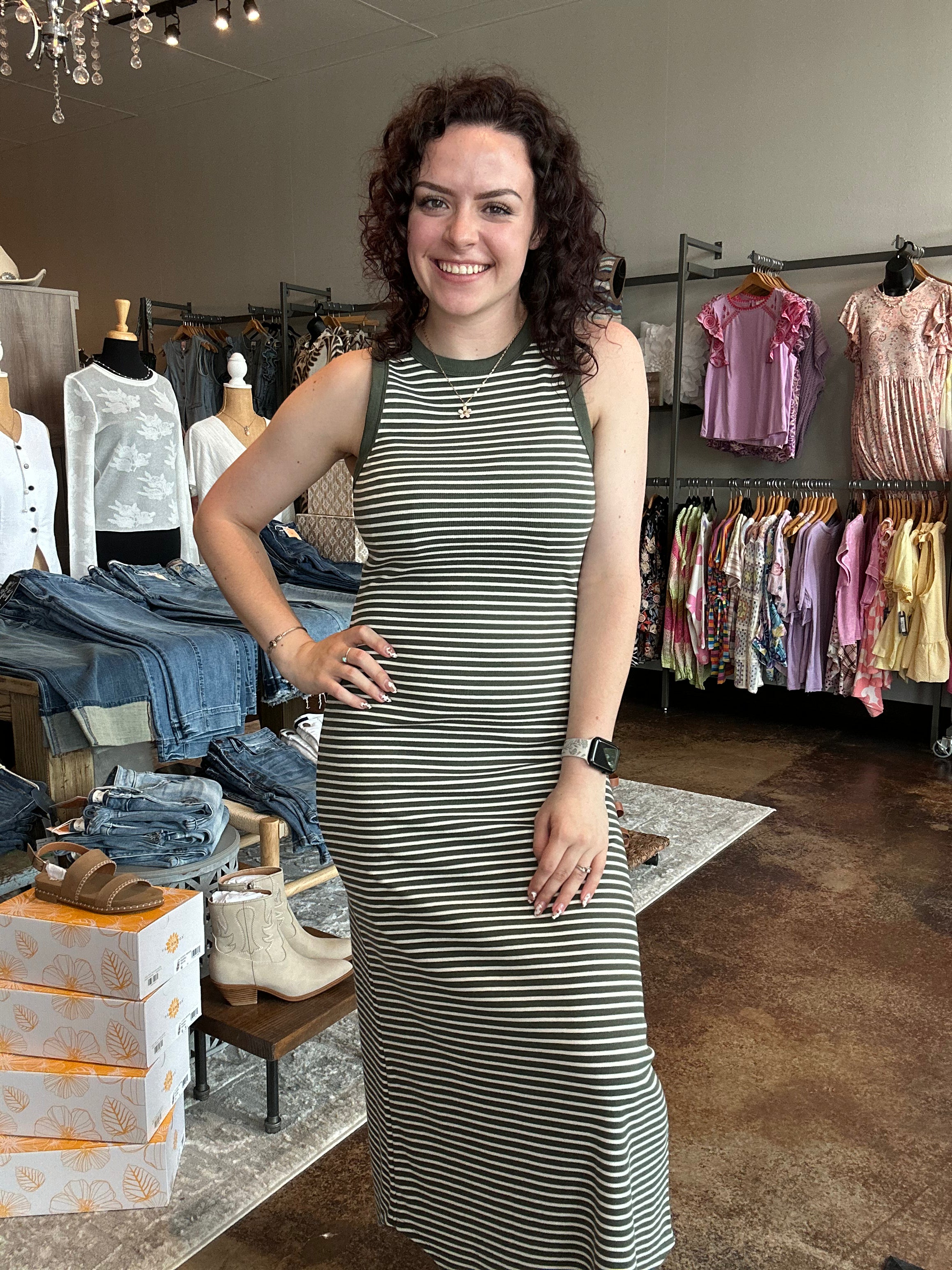 This versatile piece features a flattering midi length and comfortable ribbed fabric that moves with you while maintaining its shape. The casual design and distinctive stripe pattern make it perfect for effortless day-to-night transitions.