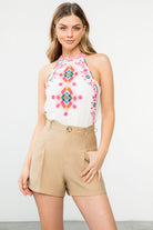 Our Halter Neck Embroidered Top is the perfect blend of elegance and playfulness. Featuring delicate embroidery and a flattering halter neckline, it adds a touch of sophistication to any outfit. The back button closure ensures a secure fit, while the lightweight fabric keeps you comfortable all day long. Whether you're dressing up for a special occasion or adding a chic touch to your everyday look, this top is a versatile addition to your wardrobe.