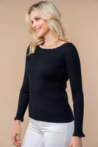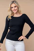 Elevate your everyday basics with our effortlessly chic Long Sleeve Scallop Detail Top. Crafted from a lightweight knit, this solid top features a classic round neckline with delicate scalloped edges that add a touch of feminine charm. The long sleeves also finish with subtle scalloped hems, offering just the right amount of detail to make this piece stand out. Designed to fit true to size, it hugs in all the right places while keeping you comfortable throughout the day. Whether paired with denim or tucked into a skirt, this top is a versatile must-have for any wardrobe.